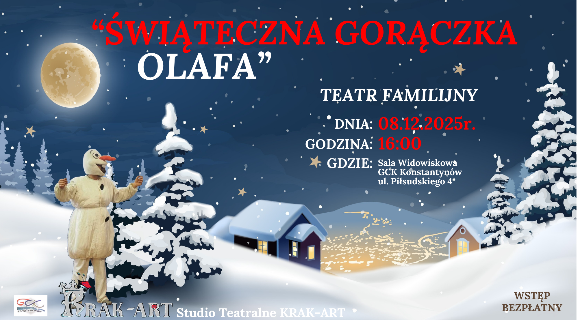 W tej rodzinnej sztuce wystąpi bałwanek Olaf, znany z popularnych animacji, który zapewni widzom świąteczną rozrywkę pełną humoru i ciepła. To doskonała propozycja dla dzieci i dorosłych, którzy chcą wspólnie poczuć magię zbliżających się Świąt.Przedstawienie realizowane przez Studio Teatralne KRAK-ART to gwarancja dobrej zabawy i świątecznej atmosfery. Wstęp jest wolny, dlatego zaproszenie skierowane jest do wszystkich mieszkańców regionu.