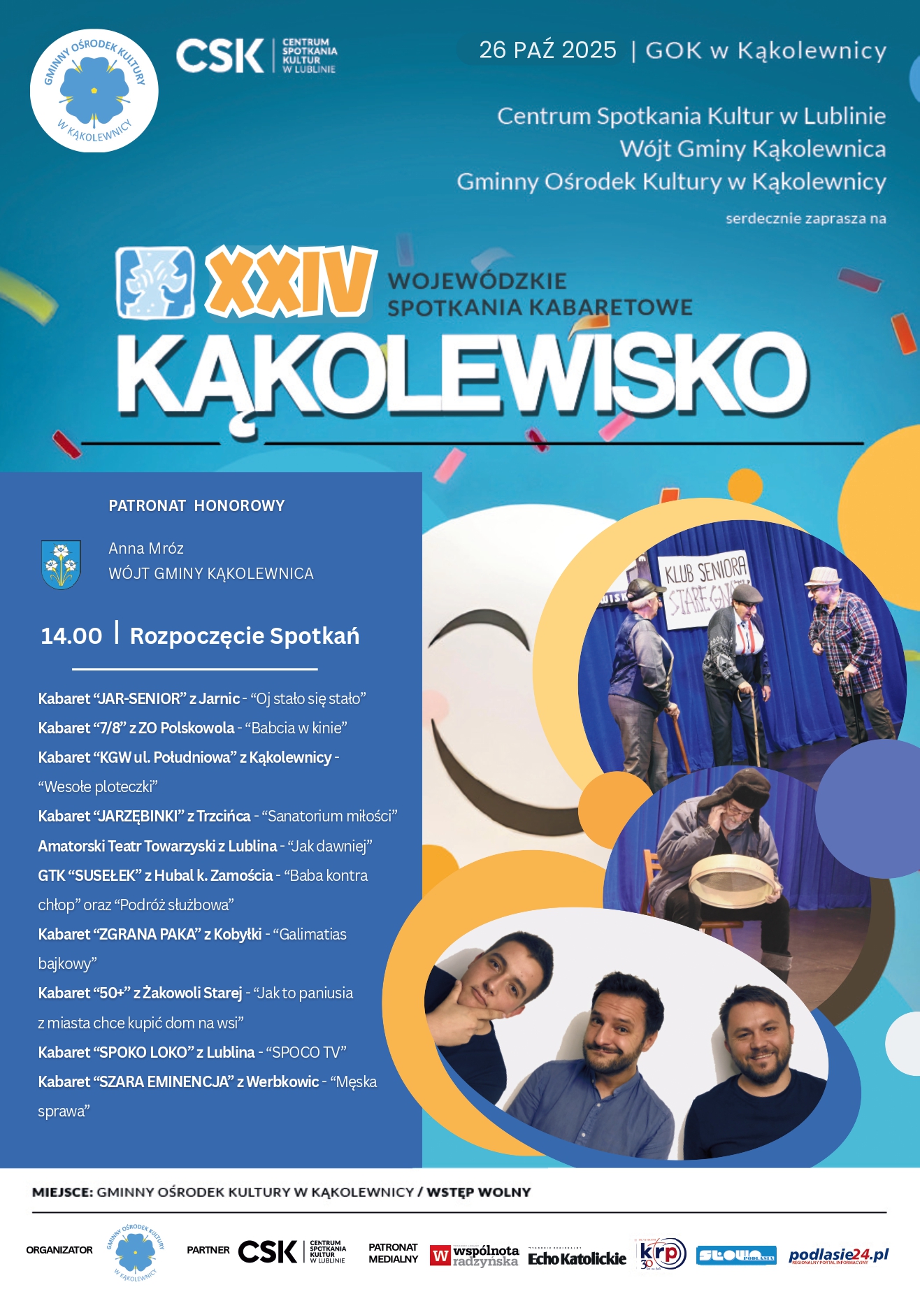 Czeka nas mnóstwa śmiechu, barwnych postaci i zabawnych skeczy ukazujących życie codzienne z przymrużeniem oka. Wszystko to podczas Kąkolewiska, czyli XXIV Wojewódzkich Spotkań Kabaretowych, które odbędą się w Gminnym Ośrodku Kultury w Kąkolewnicy. Wydarzeniu patronuje Katolickie Radio Podlasie oraz portal Podlasie24.
