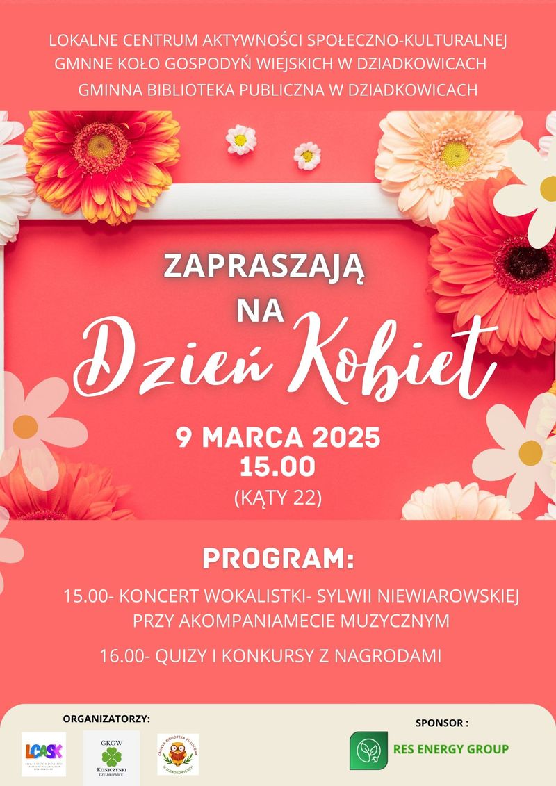 W niedzielę, 9 marca, o godz. 15.00 w ośrodku kultury (Kąty 22) z koncertem wystąpi wokalistka Sylwia Niewiarowska z akompaniamentem. Po koncercie będą quizy i konkursy z nagrodami.- Nie może Was zabraknąć ! Zaproście znajomych i spędzicie z nami ten wyjątkowy czas. - Tymi słowami do wspólnego świętowania zapraszają: Gminne Koło Gospodyń Wiejskich w Dziadkowicach, Lokalne Centrum Aktywności Społeczno-Kulturalnej w Dziadkowicach i Gminna Biblioteka Publiczna w Dziadkowicach.