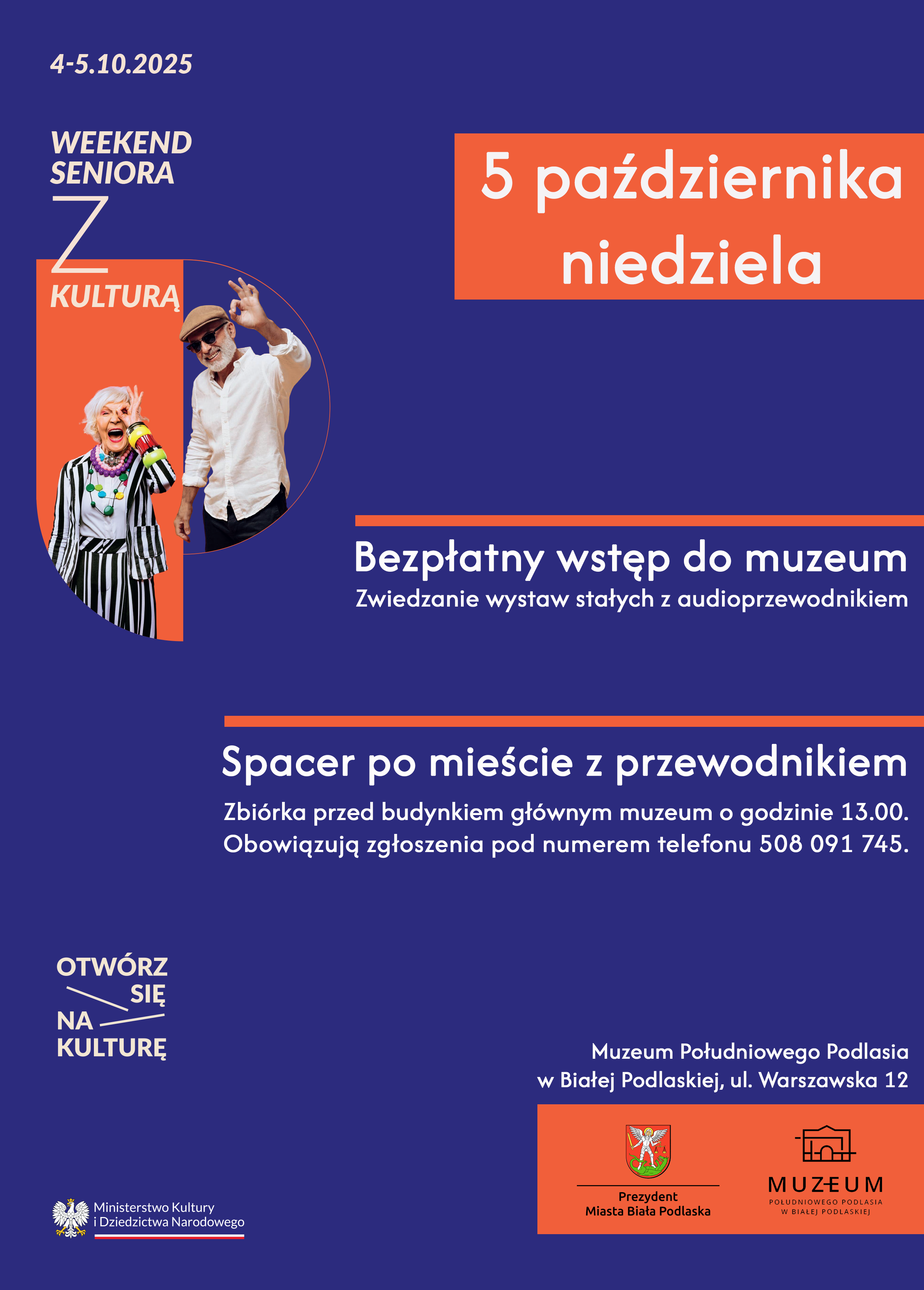 Muzeum Południowego Podlasia w Białej Podlaskiej zaprasza do uczestnictwa w wydarzeniu „Weekend seniora z kulturą”. To 12. edycja wydarzenia organizowanego przez Ministerstwo Kultury i Dziedzictwa Narodowego, które aktywizuje społeczność lokalną seniorów do uczestnictwa w życiu kulturalnym.