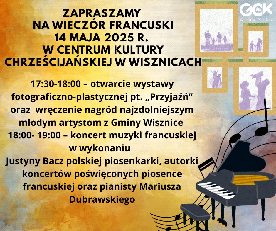 Gminny Ośrodek Kultury i Oświaty w Wisznicach zaprasza mieszkańców gminy na Wieczór Francuski, który odbędzie się 14 maja o godzinie 17:30 w Centrum Kultury Chrześcijańskiej w Wisznicach.