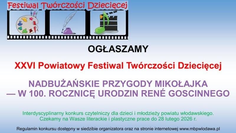 Miejska Biblioteka Publiczna we Włodawie organizuje dla dzieci XXVI Powiatowy Festiwal Twórczości Dziecięcej „Nadbużańskie przygody Mikołajka”, organizowanym w wyjątkowym roku – 100. rocznicy urodzin René Goscinnego, jednego z najwybitniejszych autorów literatury dziecięcej XX wieku. Festiwal ma formę interdyscyplinarnego konkursu literacko-plastycznego i skierowany jest do dzieci oraz młodzieży z terenu powiatu włodawskiego.Uczestnicy konkursu mogą sięgnąć po dobrze znany i uwielbiany świat Mikołajka, ale także po inne utwory René Goscinnego, interpretując je w nowy, lokalny sposób. Zadaniem uczestników konkursu jest ukazanie przygód bohaterów osadzonych na terenie powiatu włodawskiego lub inspirowanych jego miejscami – nadbużańskim krajobrazem, szkołami, codziennym życiem oraz lokalną społecznością. To doskonała okazja, by połączyć literacką klasykę z własnym doświadczeniem i wyobraźnią.