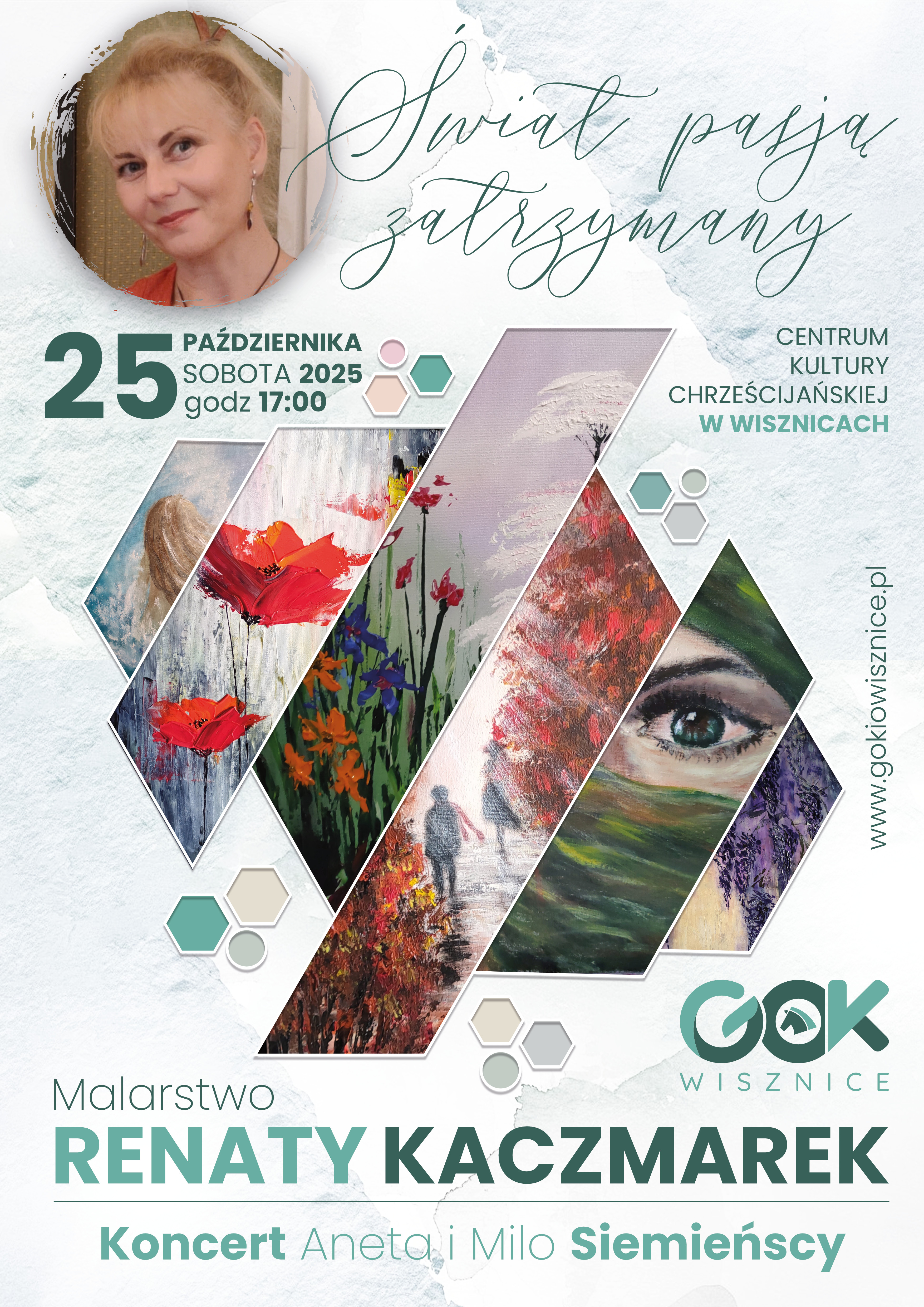 W Centrum Kultury Chrześcijańskiej w Wisznicach zaprezentowane zostaną prace Renaty Kaczmarek – artystki związanej z regionem, od lat obecnej na polskiej scenie artystycznej. Wernisaż wystawy odbędzie się 25 października o godzinie 17:00. Oprawę artystyczną spotkania zapewnią Aneta i Milo Siemieńscy.