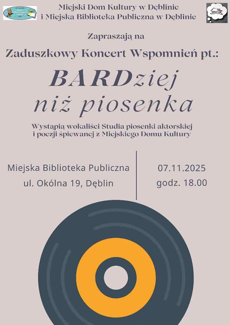 W piątkowy wieczór, 7 listopada o godzinie 18:00, w Miejskiej Bibliotece Publicznej w Dęblinie odbędzie się Zaduszkowy Koncert Wspomnień pod tytułem „BARDziej niż piosenka”.