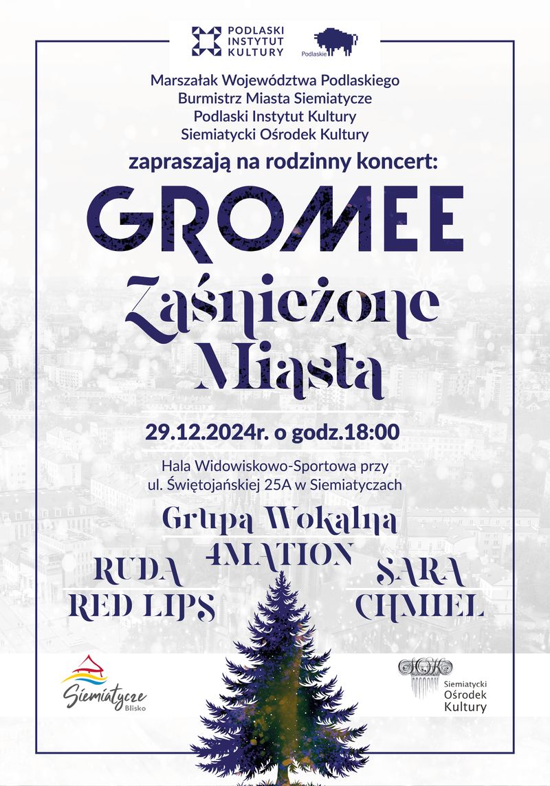 W niedzielę, 29 grudnia o godz. 18.00 w hali widowiskowo-sportowej przy ul. Świętojańskiej 25 A w Siemiatyczach zaplanowano koncert, podczas którego wystąpi Gromee oraz jego goście: Ruda z Red Lips, Sara Chmiel, Grupa Wokalna 4MATION.Na koncert zapraszają: Marszałek Województwa Podlaskiego, Burmistrz Miasta Siemiatycze, Podlaski Instytut Kultury oraz Siemiatycki Ośrodek Kultury. Wstęp wolny.