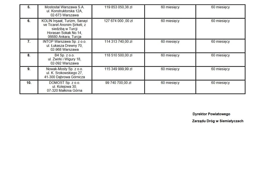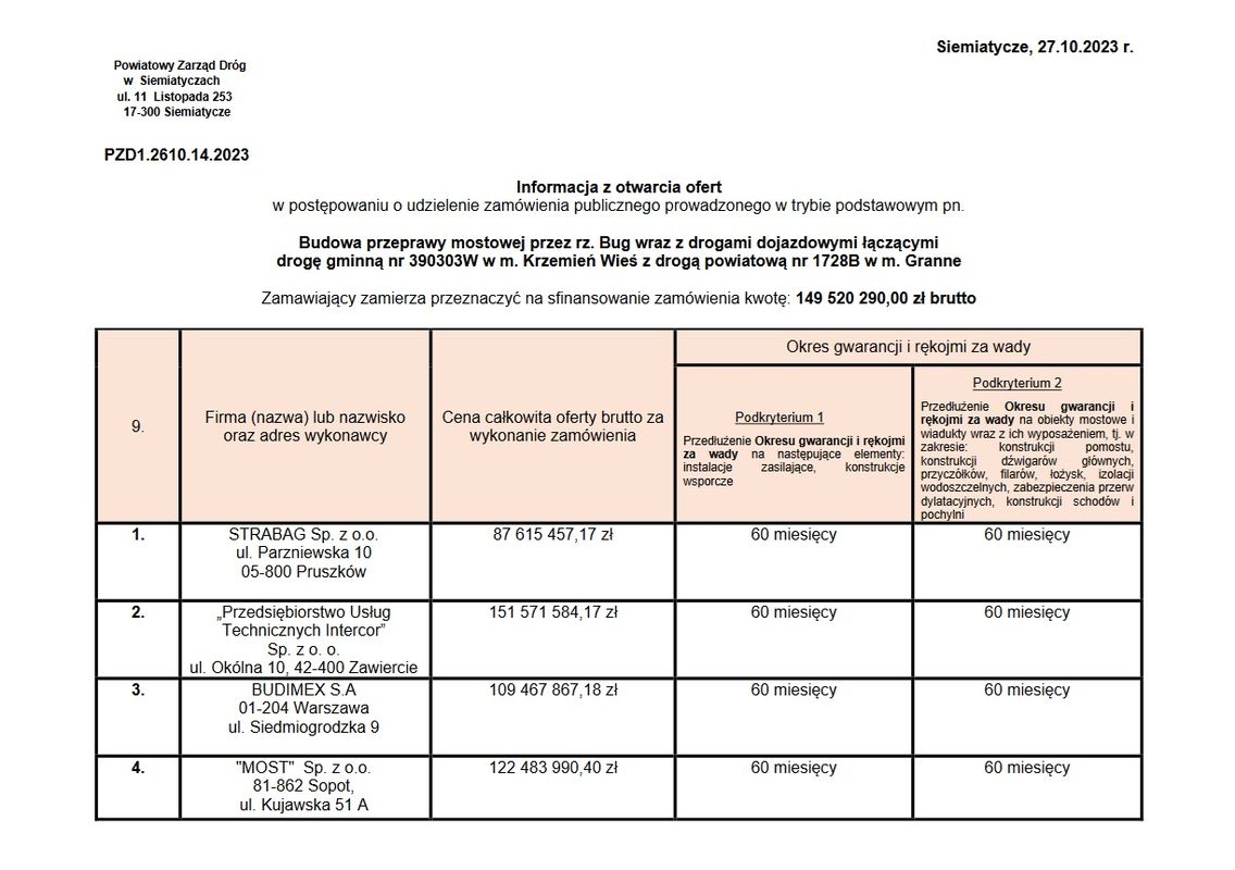 - Mieliśmy rozeznanie, że firm, które są w stanie zbudować tej wielkości most, jest w Polsce co najmniej 5, ale okazuje się, że jest ich więcej, bo interesują się tym nie tylko firmy polskie ale i międzynarodowe. Oferty złożyło 10 firm, a proponowane przez niech ceny są bardzo zróżnicowane od niespełna 88 mln zł do prawie 152 mln zł. – mówi starosta.9 na 10 złożonych ofert mieści się w szacunkach na realizację tej inwestycji. Aktualnie powiat prowadzi weryfikację ofert, a firma która złożyła najtańszą zgodnie z prawem zamówień publicznych została poproszona o złożenie wyjaśnienie w sprawie – rażąco niskiej ceny, ma na to czas do 10 listopada.