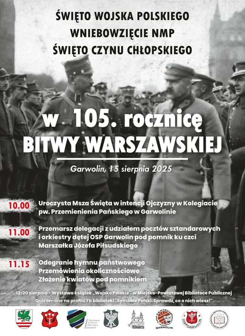 –15 sierpnia spotkamy się, by wspólnie uczcić trzy ważne dla naszej historii i tradycji wydarzenia: Święto Wojska Polskiego, Święto Czynu Chłopskiego oraz Wniebowzięcie Najświętszej Maryi Panny – mówi burmistrz Marzena Świeczak – To dzień, w którym oddamy hołd bohaterom broniącym naszej wolności, podziękujemy polskiej wsi za jej wkład w rozwój kraju i wspólnie zaniesiemy modlitwę za nasze miasto, rodziny i Ojczyznę. Serdecznie zapraszam wszystkich mieszkańców i gości do udziału w obchodach. Bądźmy razem w tym wyjątkowym dniu – dla pamięci, wspólnoty i przyszłości Garwolina.