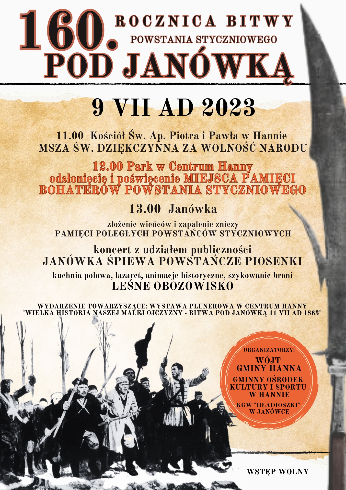 W trakcie imprezy odsłonięte i poświęcone zostanie Miejsce Pamięci Bohaterów Powstania Styczniowego w parku w Hannie. W programie przewidziano również złożenie wieńców i zapalenie zniczy pamięci Poległych Powstańców Styczniowych w Janówce. Oprócz tego w ramach obchodów odbędzie się koncert patriotyczny oraz leśne obozowisko.Szczegóły na plakacie.