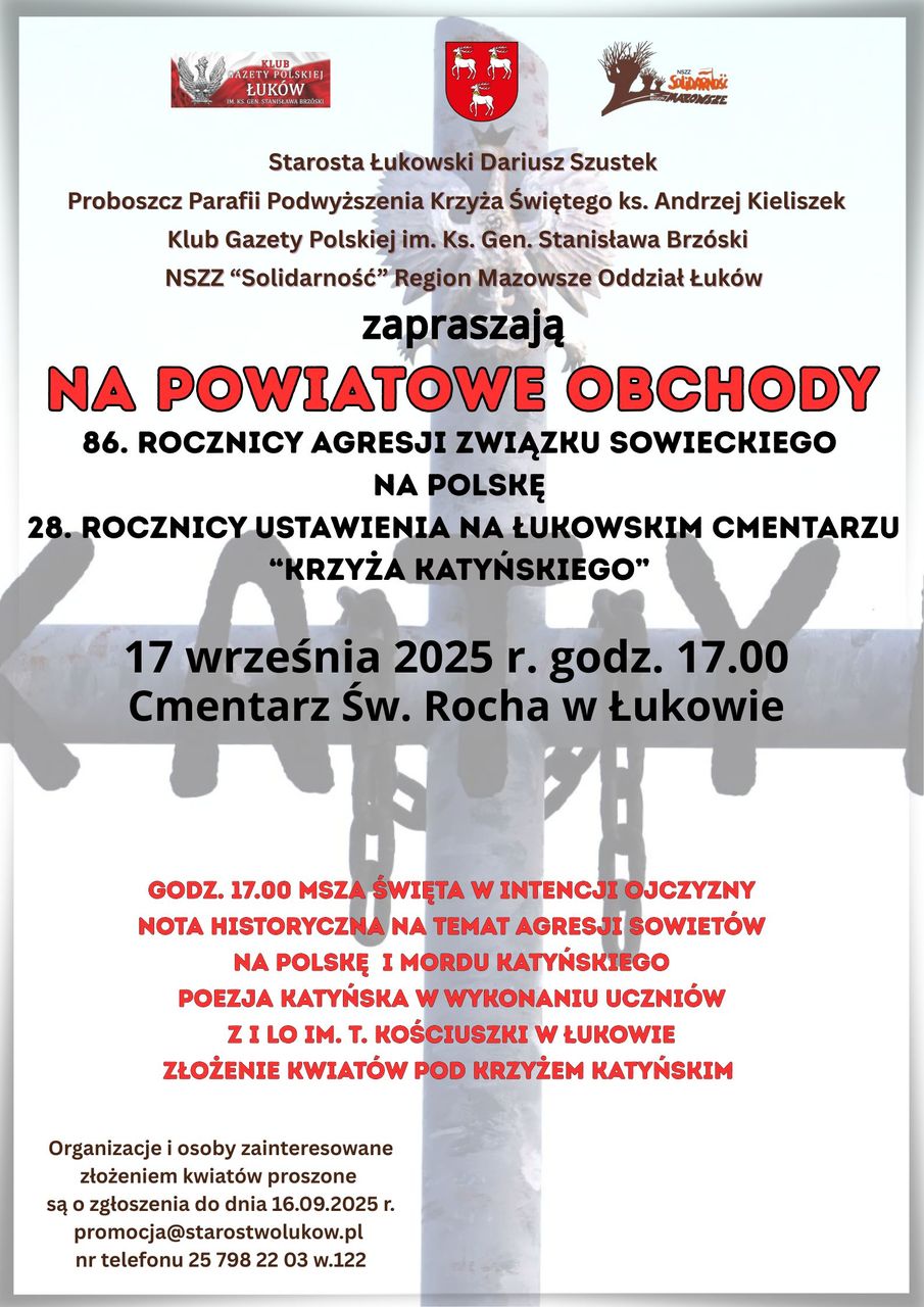 Uroczystości upamiętniające kolejne rocznice napaści Związku Sowieckiego na Polskę we wrześniu 1939 roku oraz rocznice ustawienia Krzyża Katyńskiego na łukowskim cmentarzu poświęconego mieszkańcom Ziemi Łukowskiej, którzy zginęli w sowieckich obozach oraz na froncie wschodnim, organizowało zawsze Towarzystwo Regionalne im. Jana Stanisława Majewskiego, z prezesem Zbigniewem Pasikiem na czele. W ubiegłym roku prezes Pasik zapowiedział, że kończy publiczną działalność. Dlatego też w tym roku w organizację uroczystości, które odbędą się 17 września, zaangażowały się władze powiatu łukowskiego, parafia Podwyższenia Krzyża Świętego oraz Klub Gazety Polskiej i łukowski oddział NSZZ „Solidarność”.Powiatowe obchodach 86. rocznicy agresji Związku Sowieckiego na Polskę oraz 28. rocznicy ustawienia Krzyża Katyńskiego na cmentarzu Św. Rocha rozpoczną się Mszą Świętą o godzinie 17.00. Następnie przypomniane zostaną wydarzenia z września 1939 roku. Część artystyczną przygotują uczniowie z I LO im. T. Kościuszki. Uroczystość zakończy złożenie kwiatów przed Krzyżem Katyńskim.