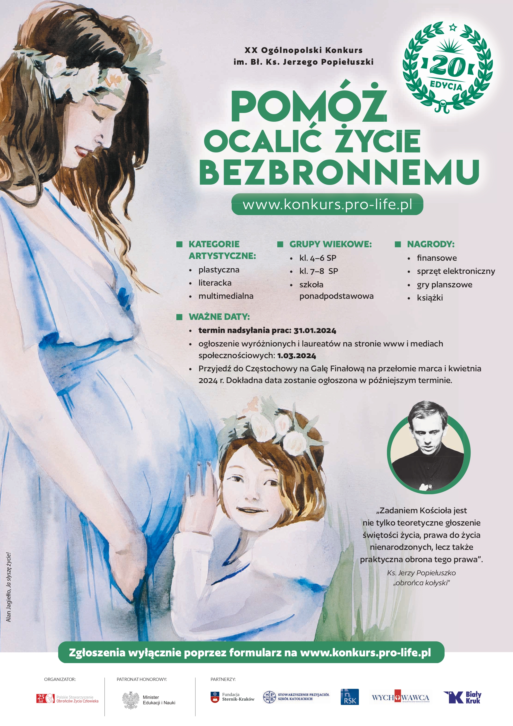 Rusza 20. edycja Ogólnopolskiego Konkursu dla Młodzieży im. bł. ks. Jerzego Popiełuszki „Pomóż ocalić życie bezbronnemu”. To konkurs, na który w ciągu 20 lat uczestnicy nadesłali około 30 tysięcy prac konkursowych. W różnych kategoriach: plastycznej, literackiej czy multimedialnej. I w różnych kategoriach wiekowych (od 4. klasy szkoły podstawowej do ukończenia szkoły ponadpodstawowej).