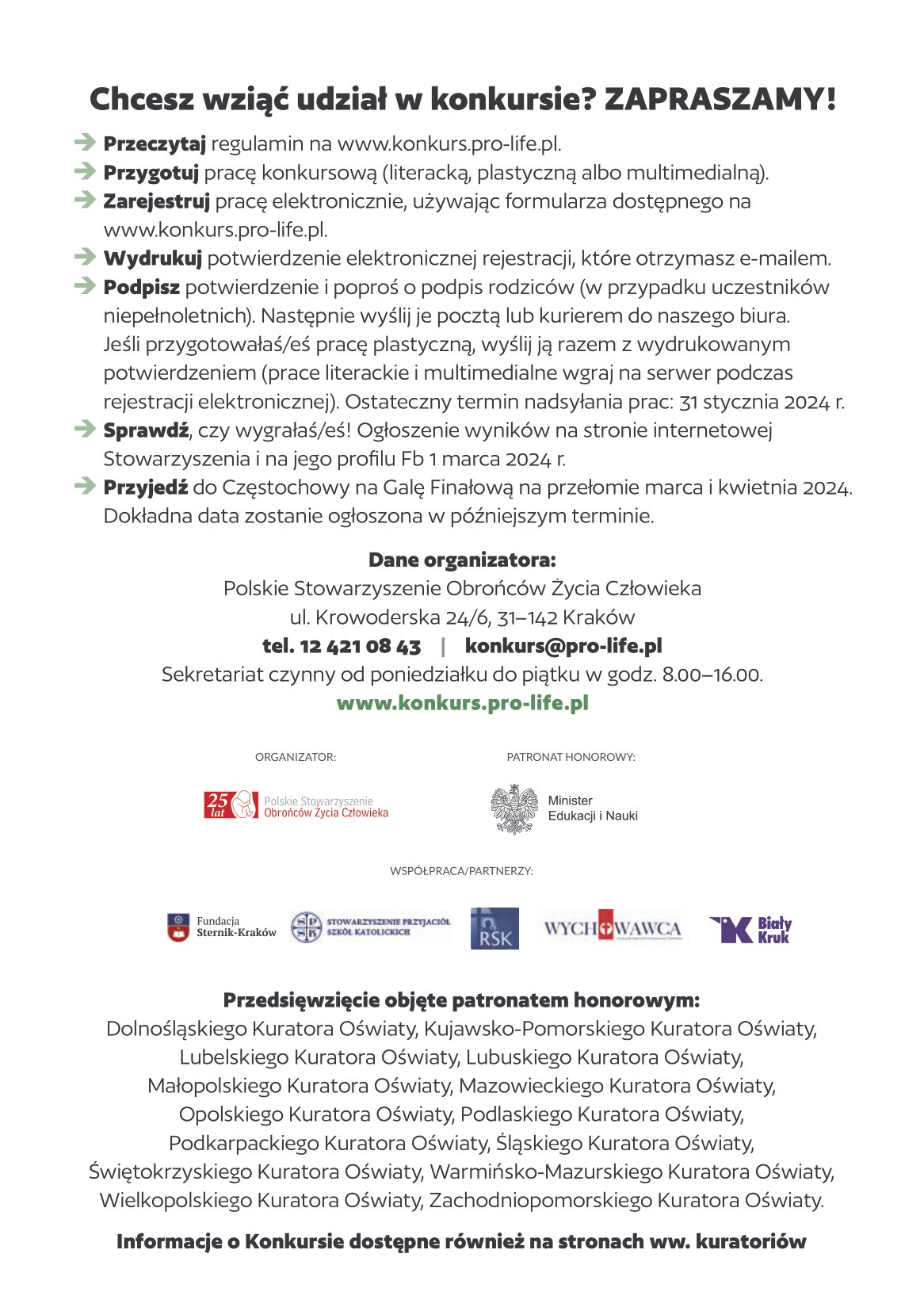 Szczegółowe informacje na temat konkursu znajdują się na stronie www.konkurs.pro-life.pl