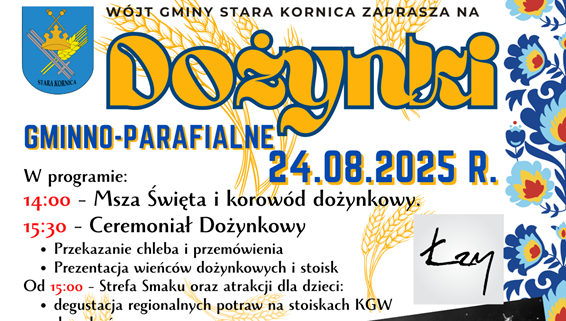 Region Łosice Patronat medialny Samorząd Stara Kornica StaraKornica Czw. 21.08.2025 10:55:03 Święto Plonów w Starej Kornicy – Dożynki Gminno-Parafialne już 24 sierpnia