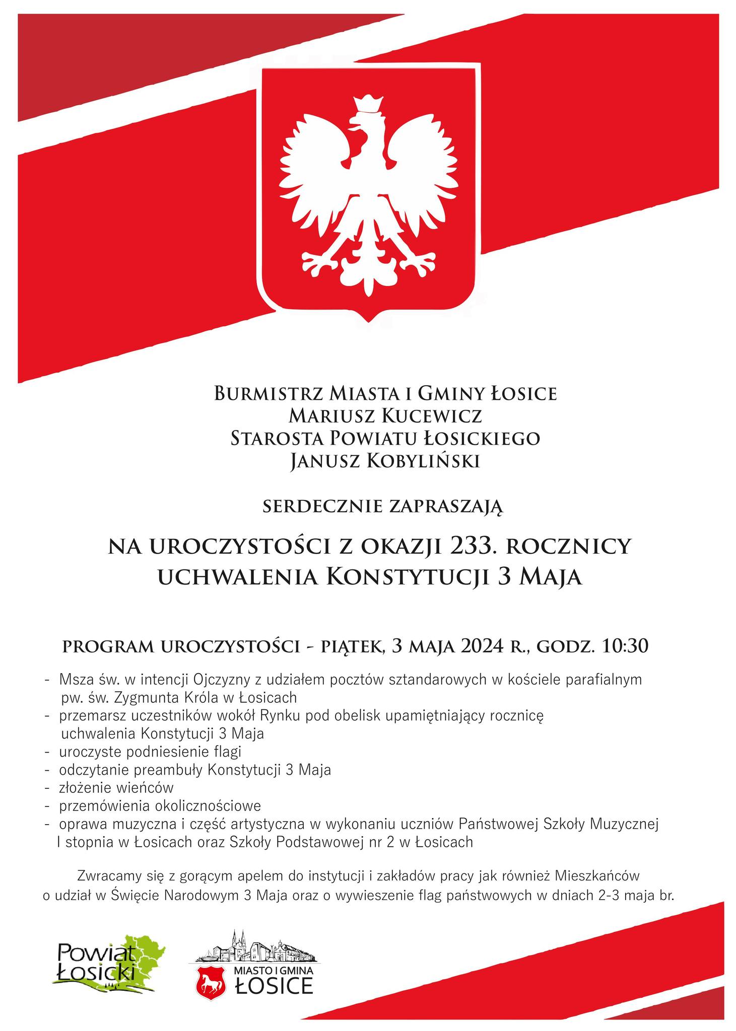 Na wydarzenie zapraszają: burmistrz Mariusz Kucewicz i starosta Janusz Kobyliński.Szczegółowy program uroczystości na plakacie:
