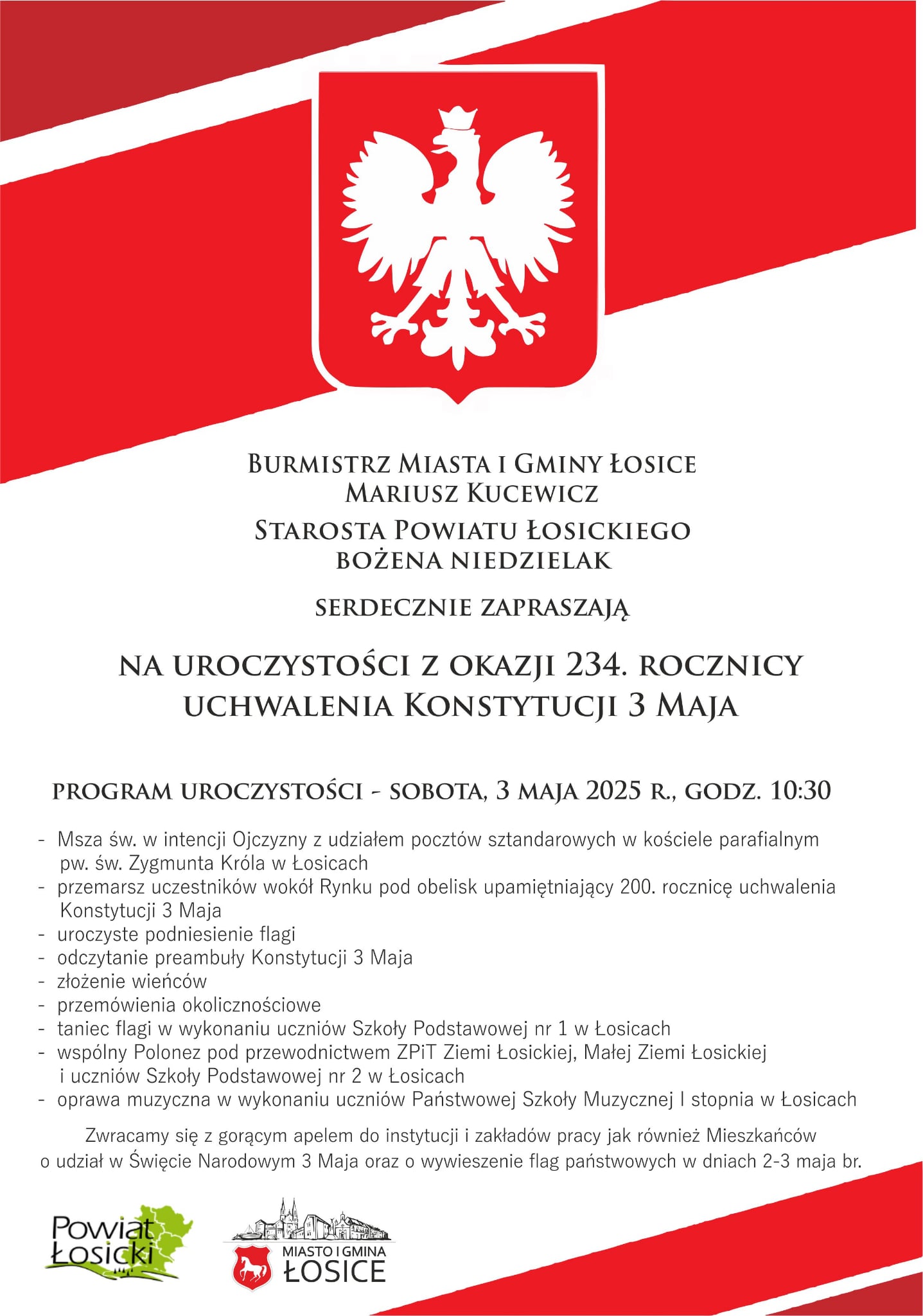 Na obchody uroczystości z okazji 234. rocznicy Uchwalenia Konstytucji 3 Maja zapraszają: burmistrz Mariusz Kucewicz i starosta Bożena Niedzielak.Poniżej program wydarzenia: