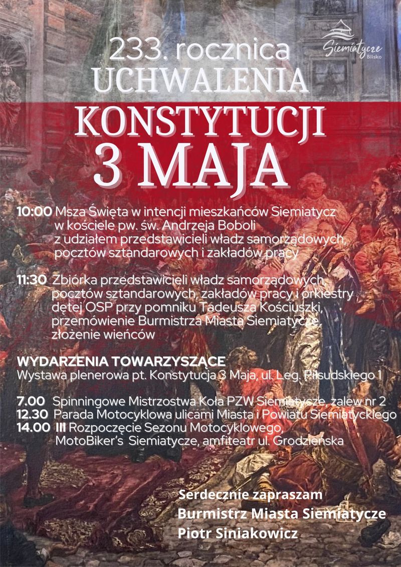 W piątek, 3 maja w Siemiatyczach odbędą się uroczystości związane z rocznicą uchwalenia Konstytucji 3 Maja. Rozpocznie je o godzinie 10:00 Msza Św. w intencji mieszkańców Siemiatycz w kościele p.w. św. Andrzeja Boboli z udziałem przedstawicieli władz samorządowych, pocztów sztandarowych oraz delegacji szkół i zakładów pracy.