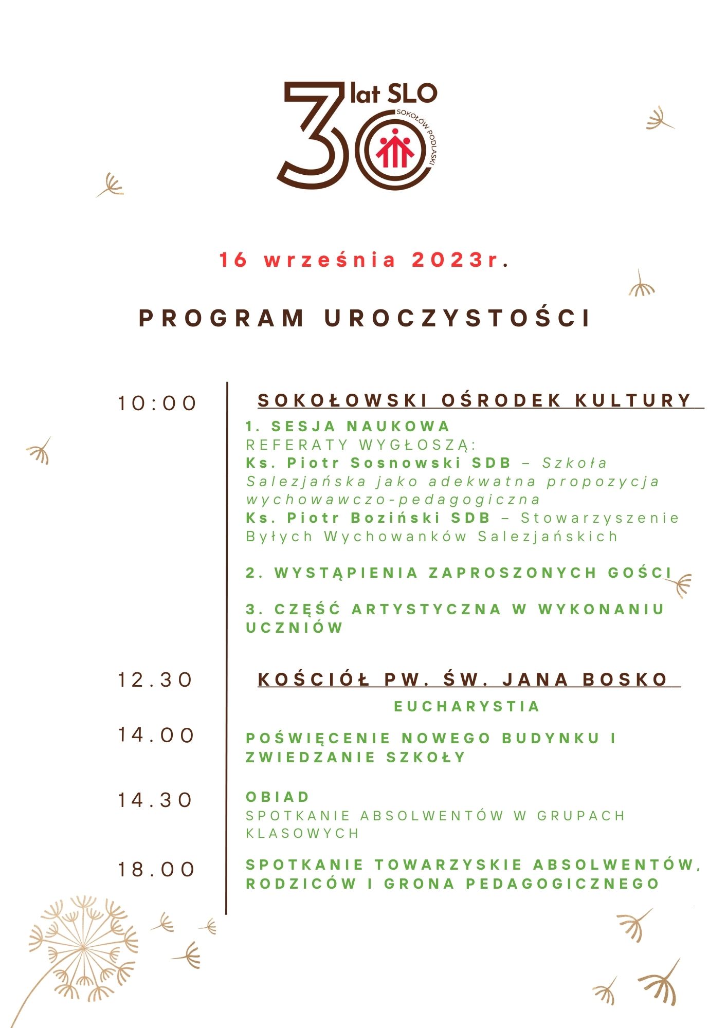 Świętowanie Jubileuszu rozpocznie się o godzinie 10.00 sesją naukową w Sokołowskim Ośrodku Kultury, podczas której referat wygłosi ks. Piotr Sosnowski i ks. Piotr Boziński. Zaplanowane jest również wystąpienie zaproszonych gości, jak również program artystyczny w wykonaniu uczniów. O godzinie 12.30 w kościele pw. św. Jana Bosko zostanie odprawiona uroczysta Msza Święta połączona ze ślubowaniem uczniów klas pierwszych Salezjańskiego Liceum Ogólnokształcącego. O 14 zaplanowano poświęcenie nowego budynku szkoły oraz zwiedzanie. Pół godziny później będzie obiad i spotkanie absolwentów w grupach klasowych, natomiast wieczorem o godzinie 18.00 rozpocznie się spotkanie towarzyskie Byłych Wychowanków Salezjańskich, Rodziców i Grona Pedagogicznego w sali „Atmosfera” (Ząbków - Kolonia 7).Zainteresowani proszeni są o kontakt telefoniczny pod numerem 048 532 453 486 bądź mailowo spawlak@sdb.pl do 10 września.