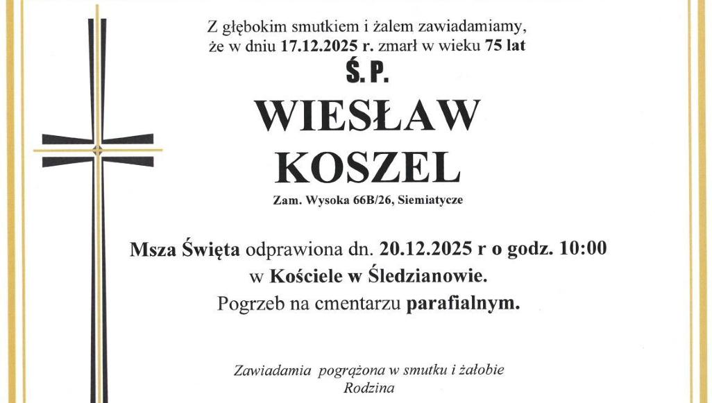 Region Siemiatycze Bielsk Podlaski Drohiczyn BielskPodlaski Pt. 19.12.2025 07:09:35 Zmarł Wiesław Koszel – kapelmistrz, społecznik, człowiek muzyki