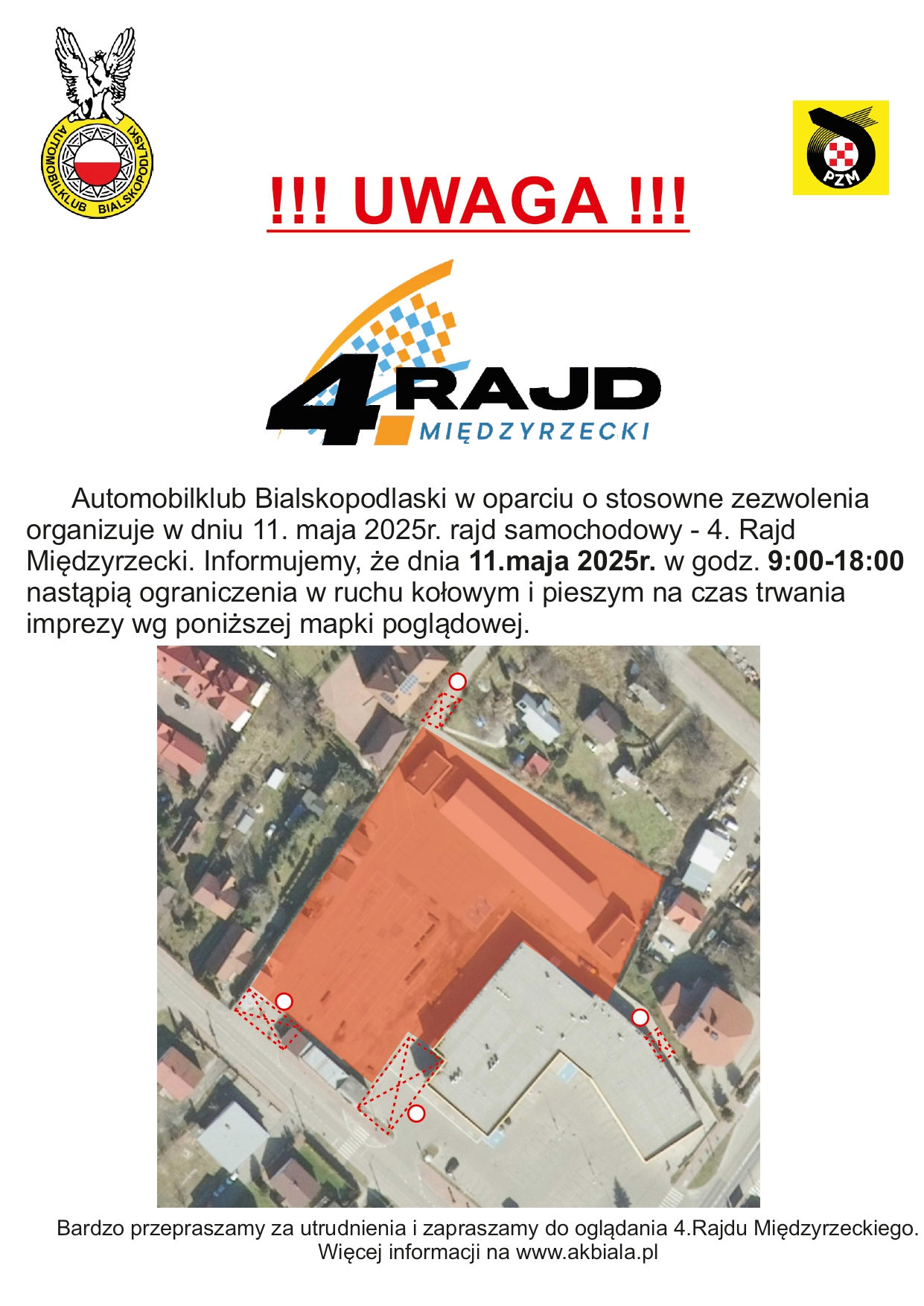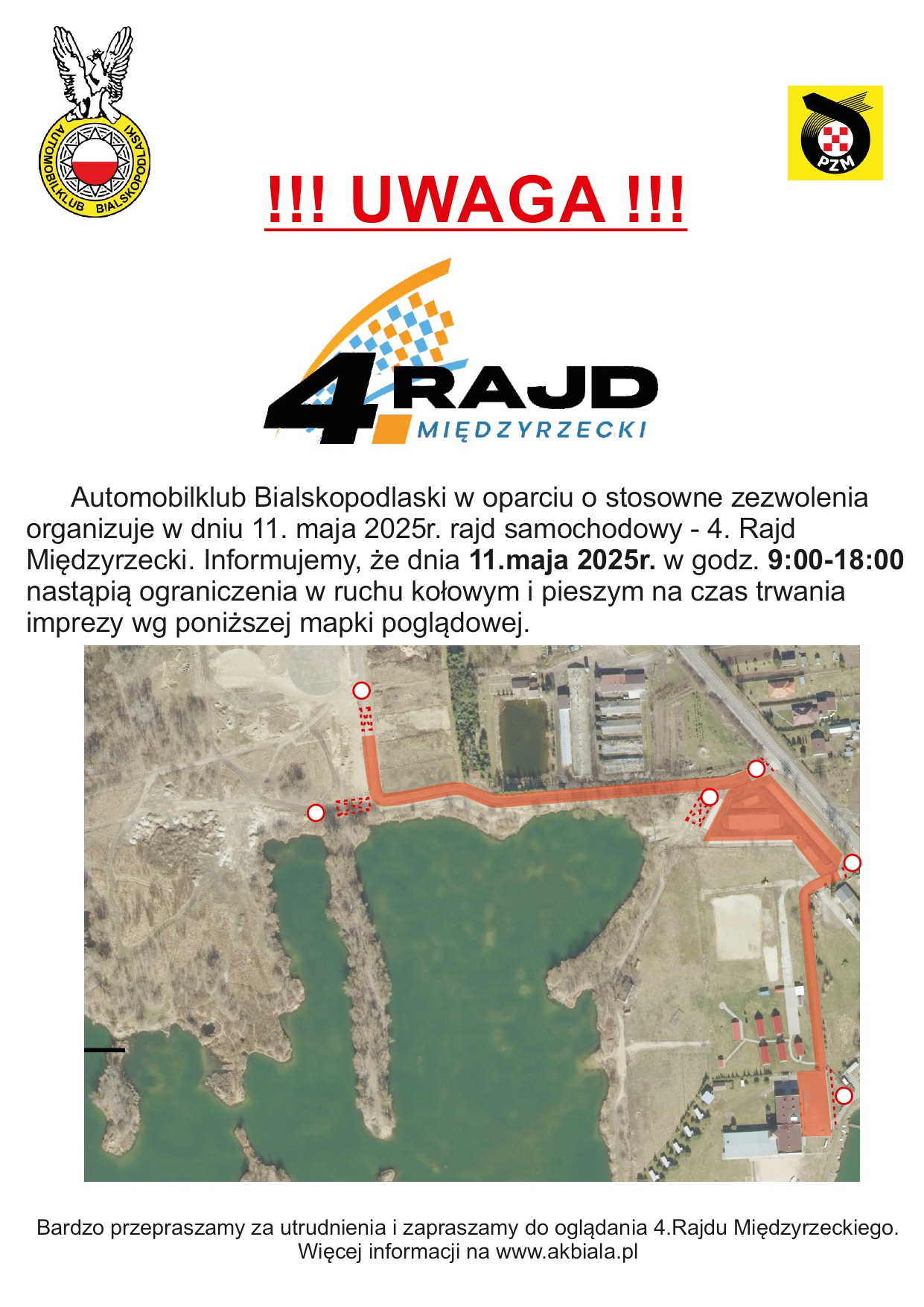 4. edycja Rajdu Międzyrzeckiego odbędzie się na terenie miasta i gminy Międzyrzec Podlaski. Organizatorem rajdu jest Automobilklub Bialskopodlaski, który przygotował trzy różnorodne próby, pokonywane trzykrotnie. Zawody dostarczą emocji i wyzwań zarówno kierowcom, jak i kibicom. Rajd odbędzie się 11 maja. W związku z Rajdem nastąpią ograniczenia w ruchu pieszych i pojazdów w godz. 9:00-18:00.