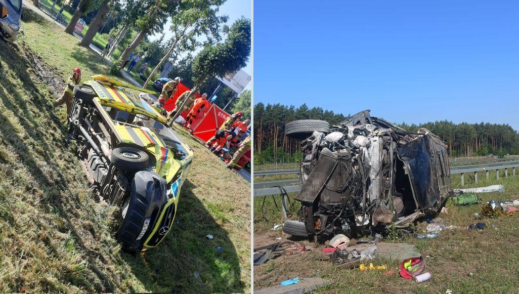 Region Garwolin Czw. 24.08.2023 08:35:46 Bus z 10 osobami dachował, karetka jadąca z rannymi zderzyła się z osobówką
