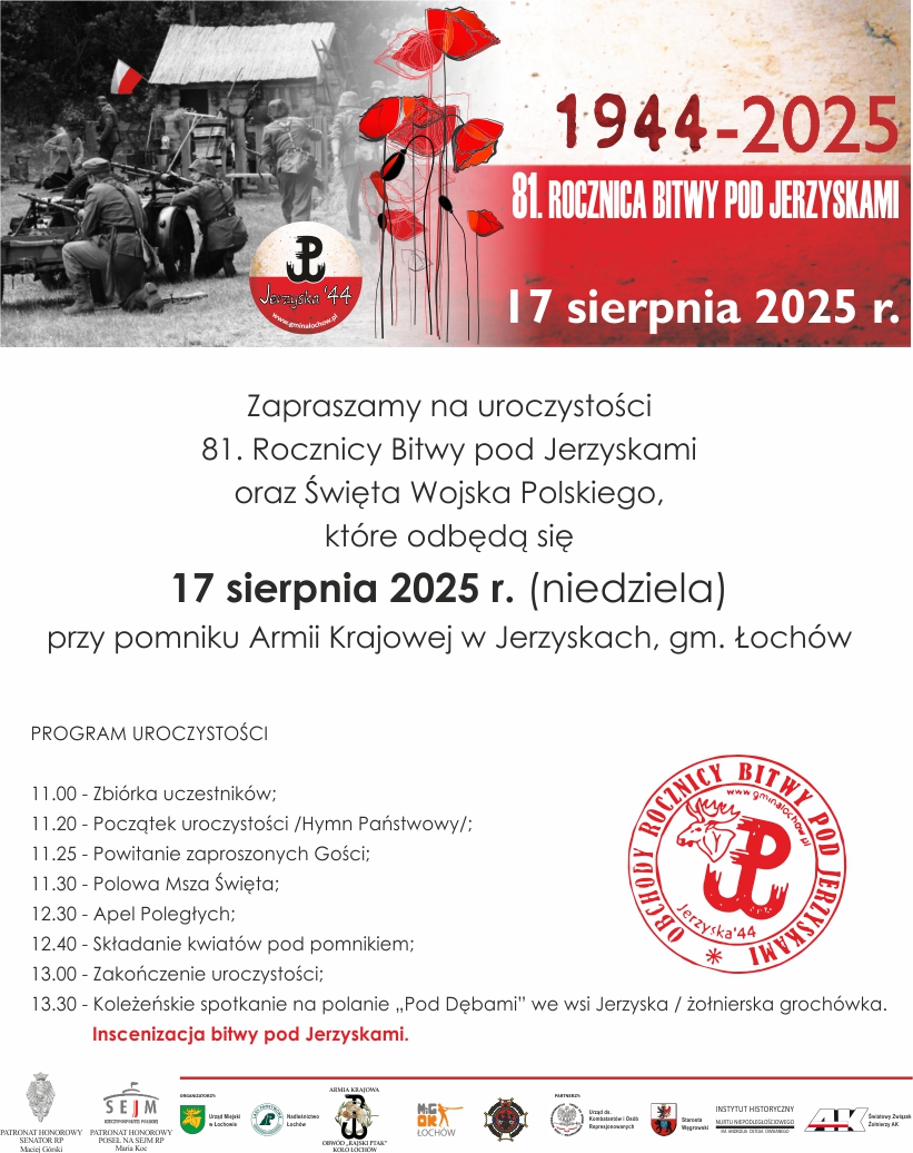 Gmina Łochów zaprasza na uroczystości upamiętniające 81. rocznicę Bitwy pod Jerzyskami oraz obchody Święta Wojska Polskiego, które odbędą się w niedzielę, 17 sierpnia, przy pomniku Armii Krajowej w Jerzyskach.