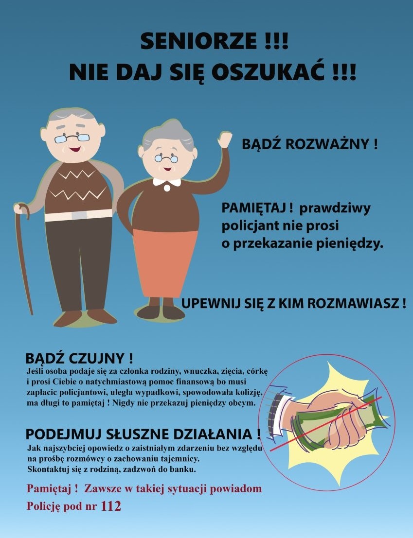 Policjanci przypominają osobom starszym o oszustach, którzy wykorzystują ludzką ufność, otwartość i szczere intencje. Pamiętajmy, że ich pomysłowość i przebiegłość jest nieograniczona. Pod pozorem okazji, nieszczęścia, podając się za krewnych, pracowników społecznych, urzędników lub funkcjonariuszy publicznych wprowadzają w błąd swoje ofiary, zyskują ich zaufanie i okradają. Tylko rozsądek i rozwaga w tym przypadku mogą uchronić nas przed staniem się ofiarą naciągaczy.