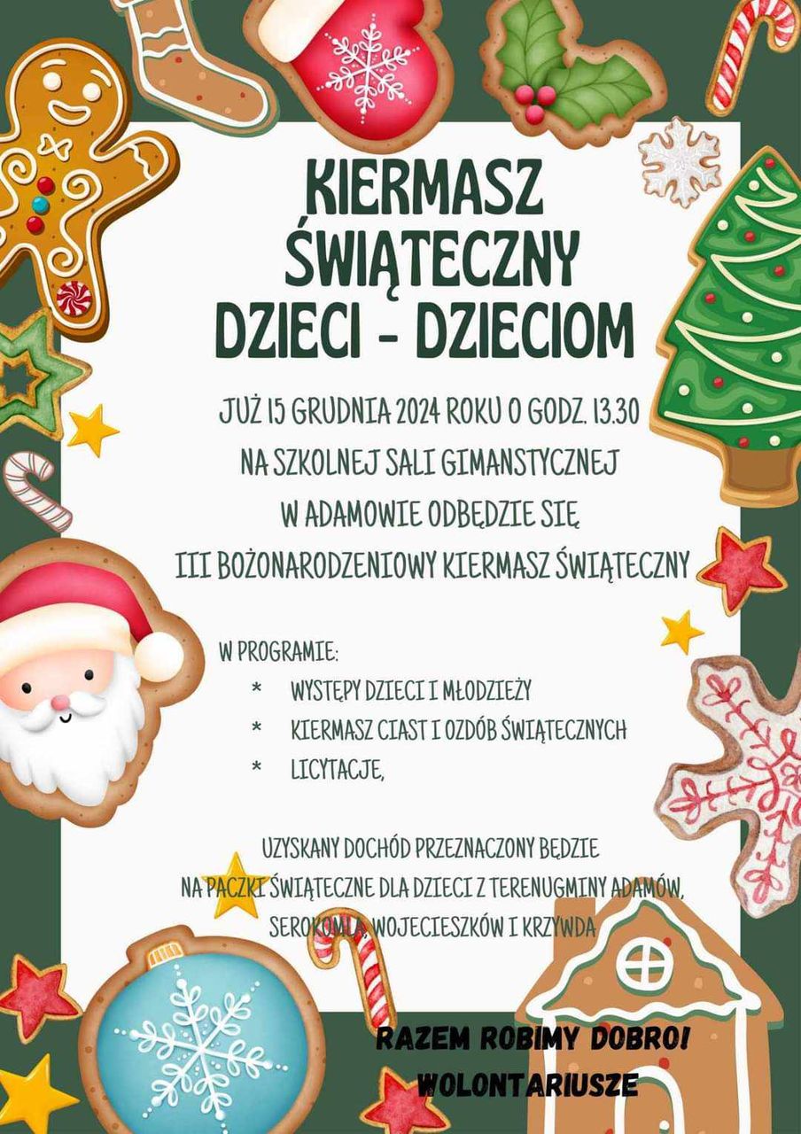 III Kiermasz Charytatywny, organizowany pod hasłem „Dzieci – Dzieciom” odbędzie się w niedzielę, 15 grudnia na szkolnej sali gimnastycznej Zespołu Szkół w Adamowie. Rozpocznie się o godzinie 13.30. Dochód z kiermaszu przeznaczony zostanie na przygotowanie świątecznych paczek dla dzieci z ubogich rodzin z gmin Adamów, Serokomla, Wojcieszków i Krzywda.Podczas kiermaszu będzie możliwość zakupu świątecznych stroików i pysznych, domowych ciast. Dzieci natomiast będą mogły podzielić się słodyczami ze swoimi rówieśnikami, składając je w odpowiednio przygotowanych miejscach.