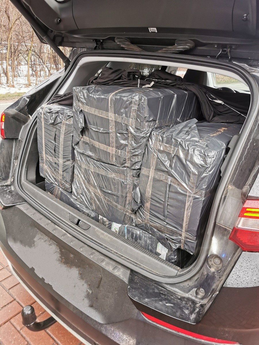 Bagażnik pojazdu oraz tylna kanapa wypełnione były pudłami owiniętymi czarną folią. Wewnątrz funkcjonariusze znaleźli papierosy. W sumie w niewielkim pojeździe osobowym kierowca zdołał ukryć ponad 9,5 tys. paczek papierosów różnych marek bez polskich znaków akcyzy. Wśród nich znajdowały się również wyroby, których przywóz na teren Unii Europejskiej jest całkowicie zabroniony – papierosy smakowe.