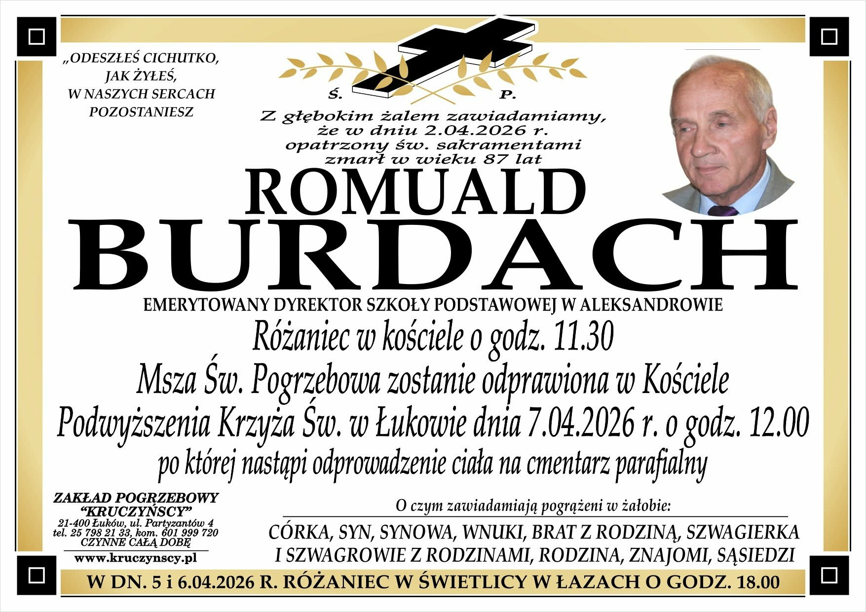 Śp. Romuald Burdach zmarł 2 kwietnia, w wieku 87 lat. Uroczystości pogrzebowe odbędą się we wtorek, 7 kwietnia. Msza Święta pogrzebowa rozpocznie się o godzinie 12.00 w kościele Podwyższenia Krzyża Świętego w Łukowie.