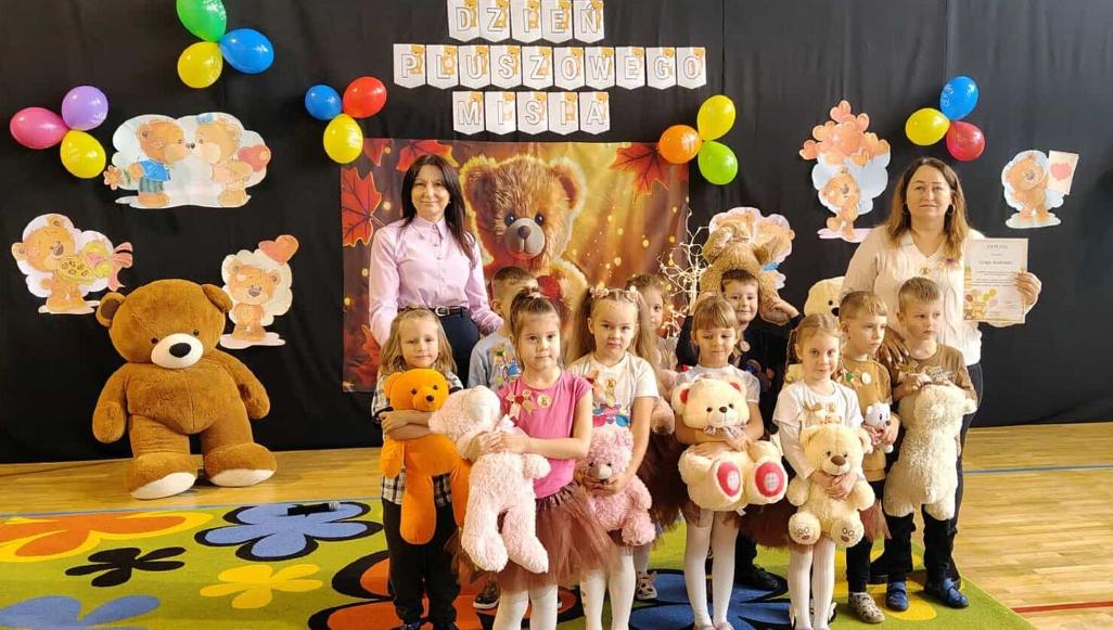 Dwa dni później, 25 listopada, przedszkolaki świętowały Dzień Pluszowego Misia – jedno z najbardziej lubianych wydarzeń w roku. Sala gimnastyczna zamieniła się w kolorową, przytulną przestrzeń pełną maskotek i balonów. Wicedyrektor Iwona Jarmoszewicz powitała dzieci, podkreślając, że pluszowy miś jest symbolem przyjaźni i ciepła.