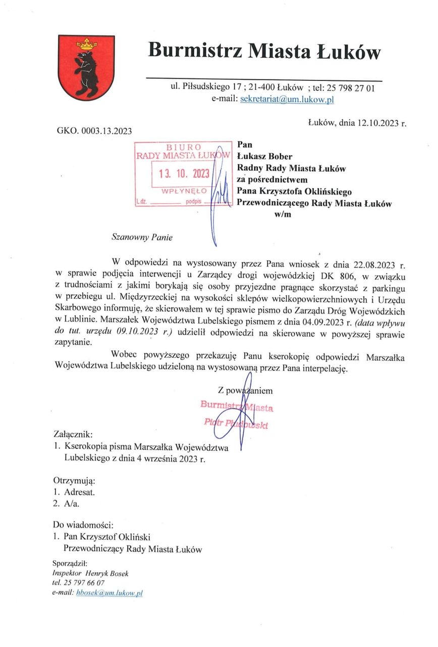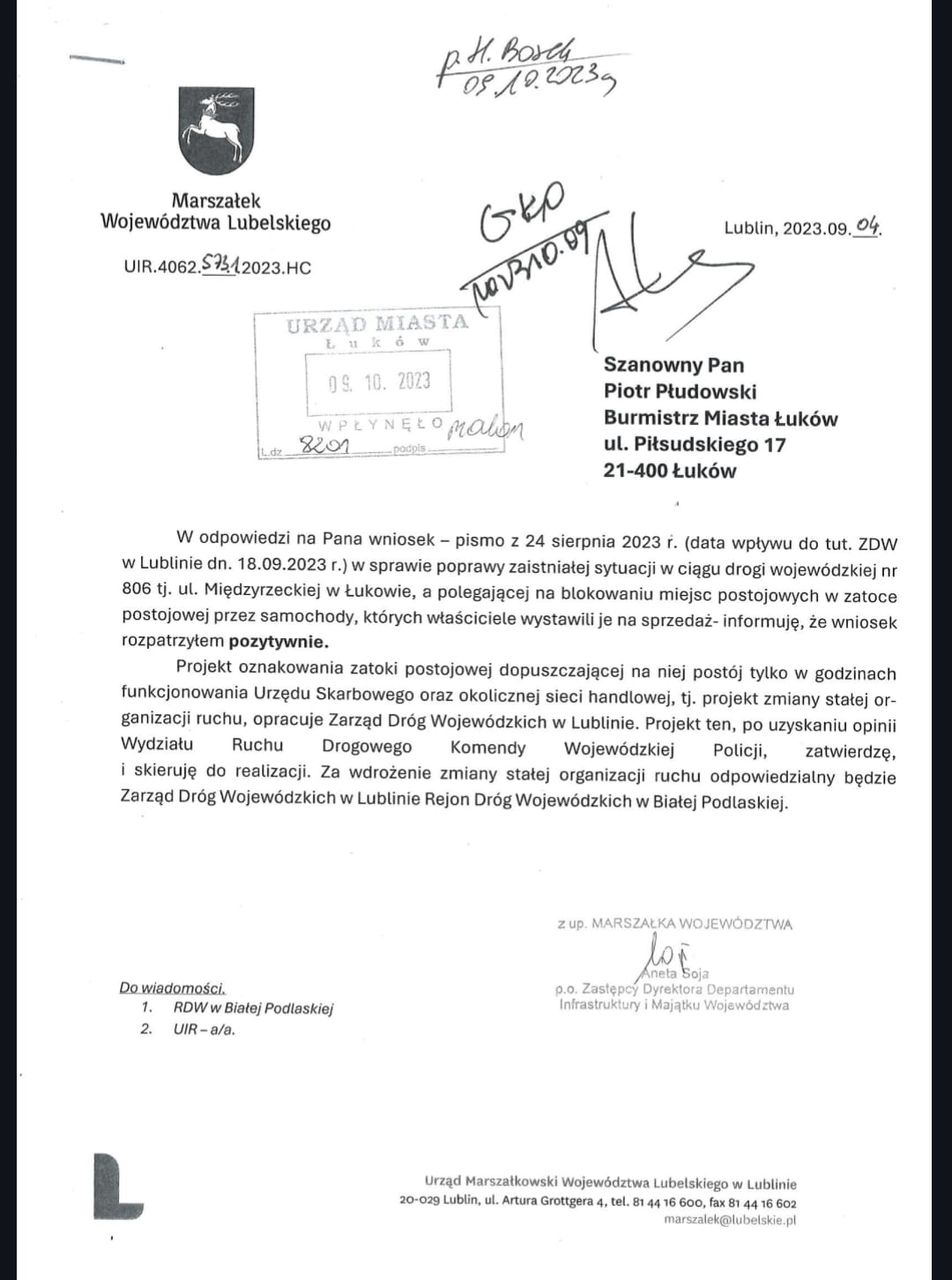 Na pismo radnego, które burmistrz Łukowa przekazał do zarządcy drogi, czyli Marszałka Województwa Lubelskiego, nadeszła odpowiedź, w której czytamy, że wniosek radnego został rozpatrzony pozytywnie. Zmianą organizacji ruchu ma zająć się teraz Rejon Dróg Wojewódzkich w Białej Podlaskiej. Radny Łukasz Bober nie ukrywa, że cieszy go taka decyzja marszałka.