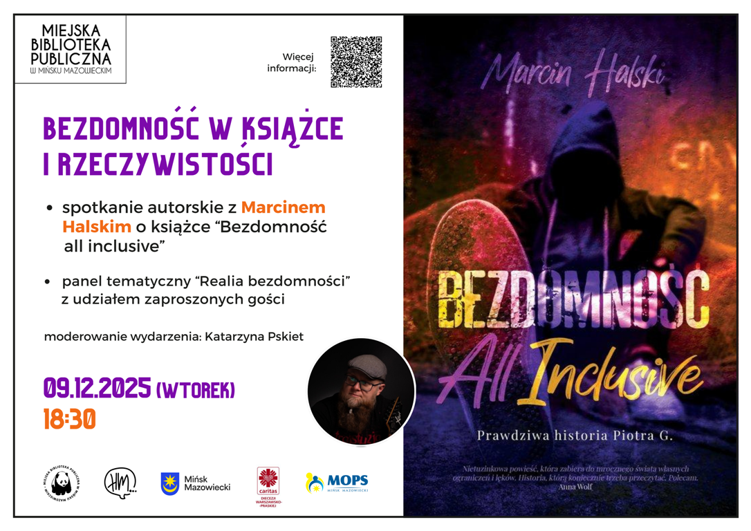 Centralną część programu stanowi rozmowa z Marcinem Halskim, autorem książki „Bezdomność all Inclusive” (wyd. HM). To powieść inspirowana prawdziwą historią, poruszająca tematy przemocy domowej, uzależnień oraz życia w warunkach skrajnego wykluczenia. Publikacja skłania do refleksji nad złożonością doświadczeń osób w kryzysie i nad mechanizmami, które prowadzą do bezdomności.W drugiej części spotkania do dyskusji dołączą: