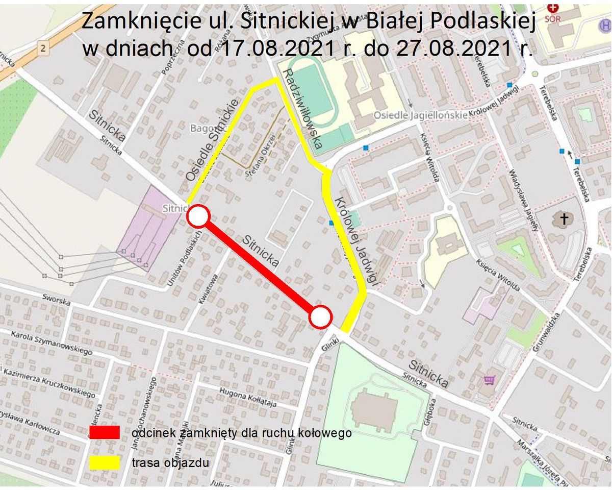 W związku z prowadzonymi pracami na ulicy Sitnickiej w Białej Podlaskiej,w dniach 17-27 sierpnia będzie ona zamknięta na odcinku od skrzyżowania z ul. Osiedle Sitnickie do skrzyżowania z ul. Glinki. Zamknięcie spowodowane jest układaniem nowej nawierzchni bitumicznej.