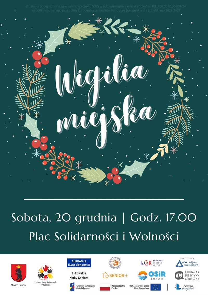 Podczas spotkania mieszkańcy będą mogli skosztować bożonarodzeniowych potraw przygotowanych przez Łukowską Radę Seniorów oraz działające na terenie miasta kluby seniora. Nie zabraknie też wspólnego kolędowania oraz świątecznych przebojów. Dodatkowo organizatorzy chcą pobić miejski rekord osób wspólnie śpiewających kolędy, który aktualnie wynosi 320 osób. Będą też życzenia i łamanie się opłatkiem.Miejskie spotkania wigilijne to kontynuacja tradycji zapoczątkowanej przez łukowskiego społecznika Andrzeja Zdrojewskiego. Tegoroczne wydarzenie odbywające się pod hasłem „By święta trwały cały rok” zaplanowano na sobotę 20 grudnia. Odbędzie się ono na Placu Solidarności i Wolności przy miejskiej choince. Początek godzina 17.00.