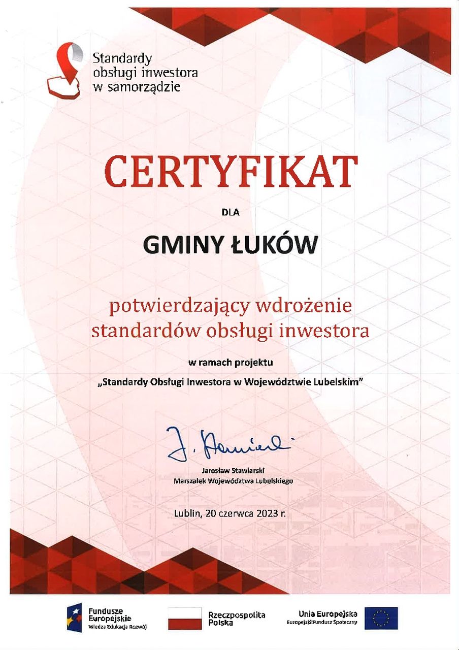 Gmina Łuków, podobnie jak i wiele innych samorządów, brała udział w trzyletnim projekcie pod nazwą „Standardy Obsługi Inwestora w Województwie Lubelskim”. Był to projekt realizowany przez Urząd Marszałkowski Województwa Lubelskiego. Podsumowaniem tych trzyletnich działań była gala, która odbywała się 20 czerwca w Lubelskim Centrum Konferencyjnym. Podczas tego spotkania samorządowcy otrzymali certyfikaty potwierdzające wdrożenie w urzędach standardów obsługi inwestora. Wręczali je sekretarz stanu w Ministerstwie Finansów Artur Soboń i wicemarszałek województwa lubelskiego Zbigniew Wojciechowski.Jeden z takich certyfikatów odebrał wójt gminy Łuków Mariusz Osiak: