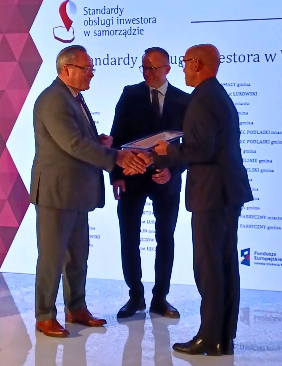 Wójt gminy Łuków Mariusz Osiak odebrał certyfikat potwierdzający wdrożenie w urzędzie standardów obsługi inwestora. Jak sam mówi, jest to dla niego potwierdzenie, że jeżeli chodzi o rozwój przedsiębiorczości na terenie gminy, to razem z pracownikami i radnymi idą dobrą drogą.