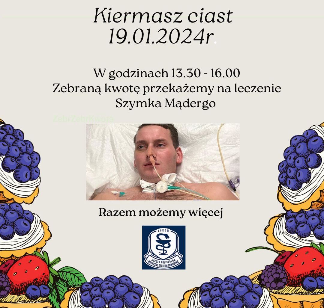 Szymek Mądry z Łukowa ma 24 lata. Niedawno został mężem i ojcem. Na początku grudnia ubiegłego roku podczas pracy przy wycince drzew uległ wypadkowi. Do szpitala trafił w bardzo ciężkim stanie. Miał rozległy uraz mózgu wraz z wielokrotnymi złamaniami wieloodłamowymi kości czaszki i twarzoczaszki. Doszło również do ostrej niewydolności oddechowej. Życie młodego mężczyzny udało się uratować. Teraz jednak potrzebuje specjalistycznej rehabilitacji.Rodzina Szymka ogłosiła zbiórkę na stronie siepomaga.pl. Organizowane są też różne akcje pomocowe. Jedna z nich odbędzie się w najbliższy piątek, 19 stycznia w Szkole Policealnej – Medycznym Studium Zawodowym w Łukowie. Będzie to Charytatywny Kiermasz Ciast. Słodkie wypieki, z których dochód zostanie przeznaczony na rzecz Szymka Mądrego, będzie można kupować w godzinach od 13.30 do 16.00.