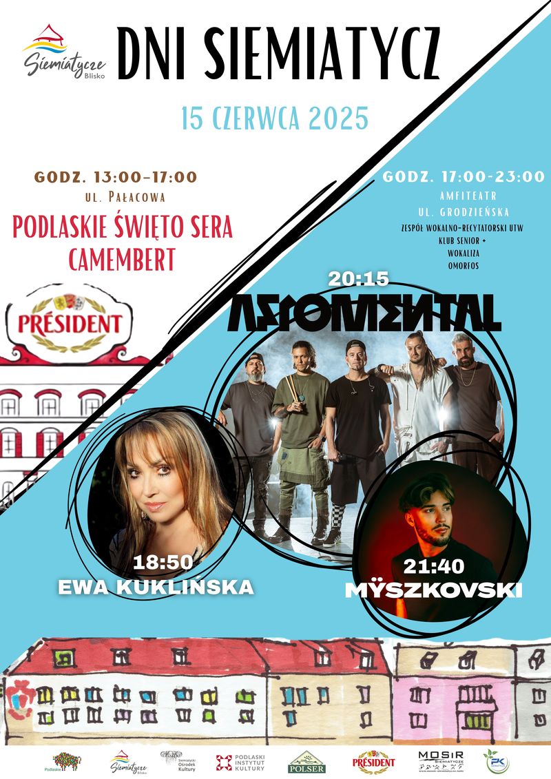 Muzyczne, niedzielne popołudnie rozpocznie się o godz. 17:00 i potrwa do 23:00. W amfiteatrze przy ul. Grodzieńskiej zaprezentują się lokalne zespoły i artyści, w tym: zespół wokalno-recytatorski UTW, Klub Seniora, Wokaliza, Omorfos oraz zaproszeni goście specjalni: Ewa Kuklińska (godz. 18:50), Afromental (godz. 20:15) i Myszkovski (godz. 21:40).Zanim rozpocznie się muzyczne spotkanie, w Siemiatyczach zaplanowano Podlaskie Święto Sera Camembert – spotkanie w klimacie francuskim odbędzie się w godz. 13:00–17:00 na ul. Pałacowej (róg Zaszkolnej). W programie: degustacje, pokazy kulinarne z mistrzem Krzysztofem Gawlikiem, animacje, występy dzieci i lokalnych zespołów, zabawy, dmuchańce i muzyka na żywo we francuskim klimacie.