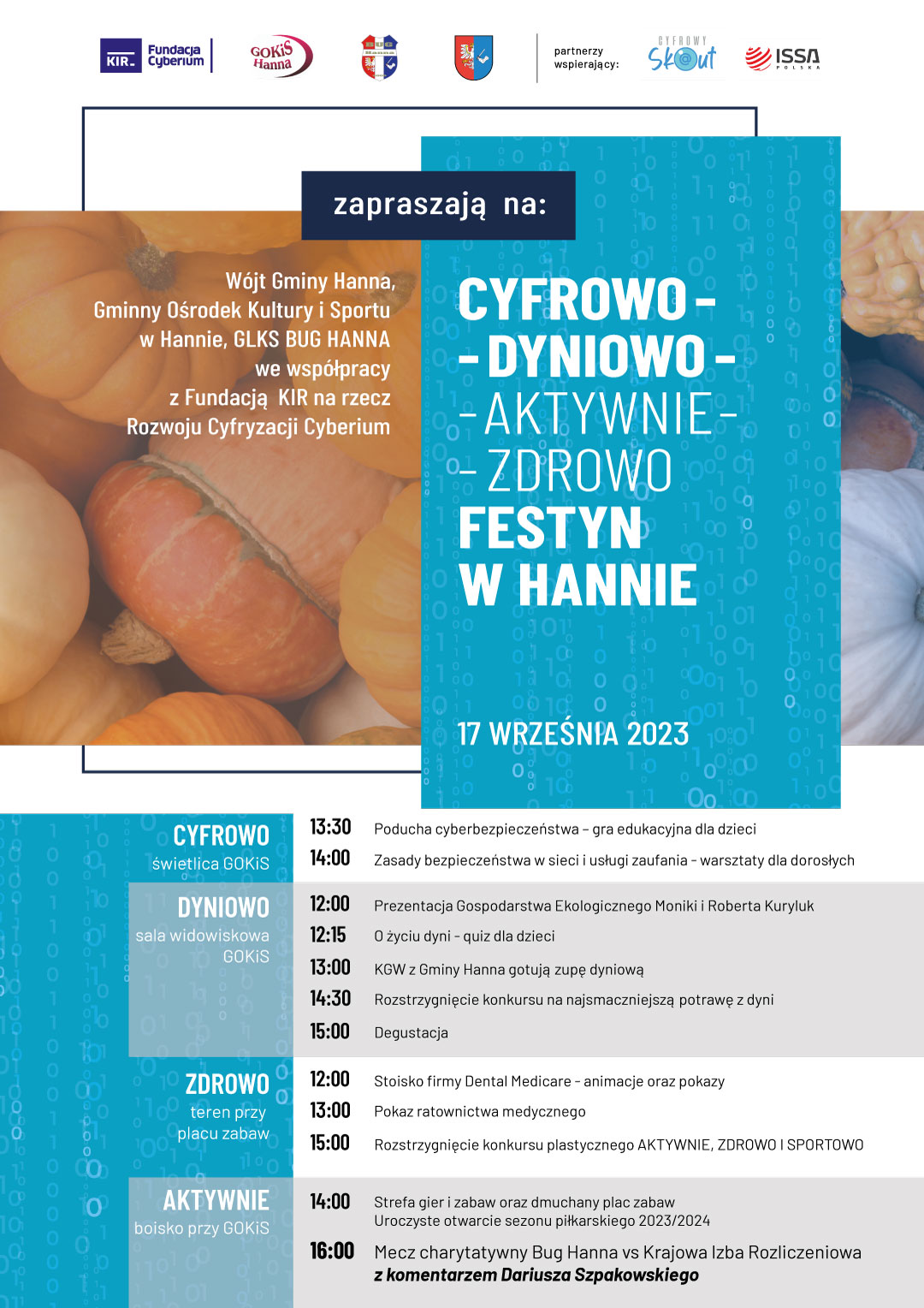 W niedzielę, 17 września w Hannie odbędzie się wyjątkowe wydarzenie. O 13:30 rozpocznie się festyn, który został podzielony na 4 bloki tematyczne: tematyczne cyfrowy z warsztatami bezpieczeństwa w sieci, dyniowy z Quizem, konkursem kulinarnym i degustacją, zdrowy - podczas, którego będzie można podnieść swoje kompetencje w zakresie pierwszej pomocy oraz aktywny - gdzie uroczyście rozpoczęty zostanie sezon piłkarski 2023/2024.