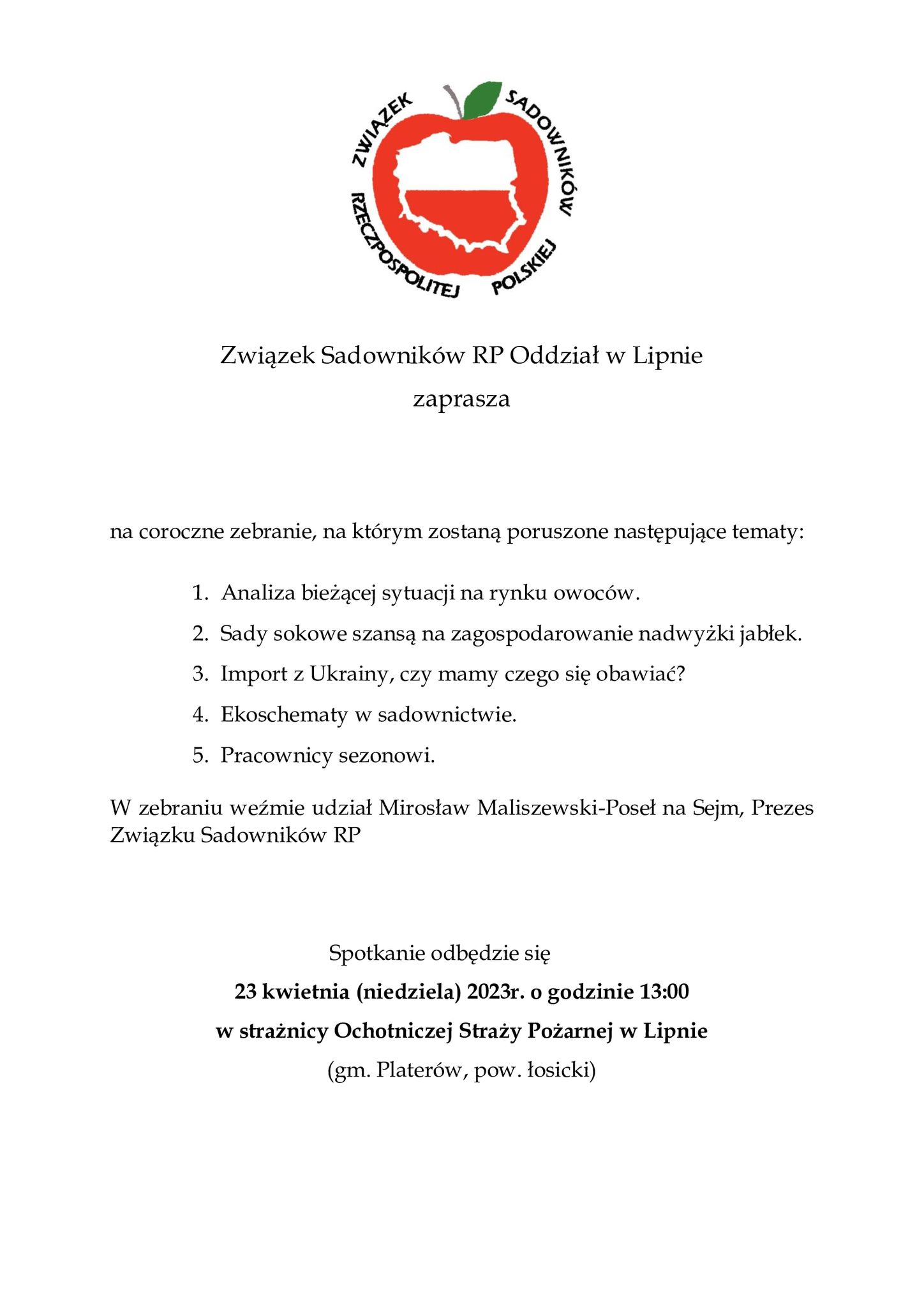 23 kwietnia, w strażnicy OSP w Lipnie, w gminie Platerów odbędzie się spotkanie poświęcone sytuacji na rynku owoców.
