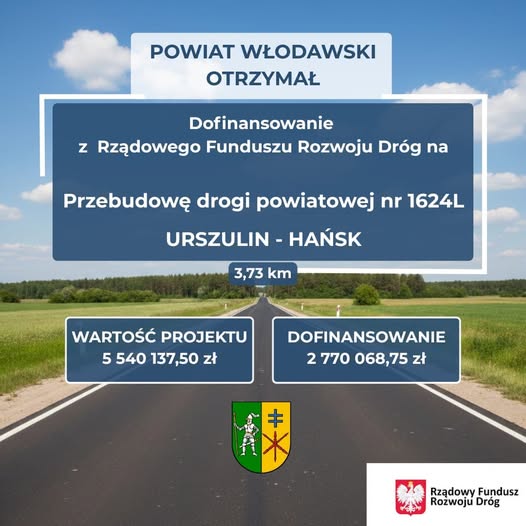 W piątek, 20 lutego, Urząd Wojewódzki w Lublinie ogłosił rozstrzygnięcie wniosków złożonych w ramach Rządowego Funduszu Rozwoju Dróg. Wśród pozytywnie ocenionych projektów znalazła się inwestycja zgłoszona przez Powiat Włodawski, przebudowa drogi powiatowej nr 1624 L na odcinku Urszulin – Hańsk.Dofinansowanie obejmuje 3,7-kilometrowy odcinek drogi powiatowej na trasie Andrzejów – Kulczyn. Całkowita wartość inwestycji wynosi 5 540 137,50 zł, z czego przyznane dofinansowanie to 2 770 068,75 zł. Realizacja zadania znacząco poprawi komfort i bezpieczeństwo użytkowników drogi, a także wpłynie na lepszą dostępność komunikacyjną okolicznych miejscowości.