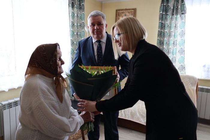 Oprócz życzeń zdrowia, wszelkiej pomyślności, wytrwałości i siły oraz spokojnych dni w otoczeniu pełnym troski i miłości najbliższych, Wójt Gminy wręczył Jubilatce wyciąg jej aktu urodzenia sprzed 105 lat oraz bukiet kwiatów.Kazimiera Czmiel urodziła się 6 marca 1918 r. w Borucisze. Od młodzieńczych lat bardzo ciężko pracowała na roli, a w okresie zimy i wolnym czasie oddawała się swojej pasji tkackiej. Doczekała się 7 wnucząt, 11 prawnucząt i 1 praprawnuka. Jest osobą religijną, pogodną, lubiącą spędzać czas w towarzystwie innych osób. Cieszy się w miarę dobrym zdrowiem. Jak podkreśla, długowieczność nie zależy od człowieka tylko Stwórcy. Żyje otoczona miłością i życzliwością najbliższych.