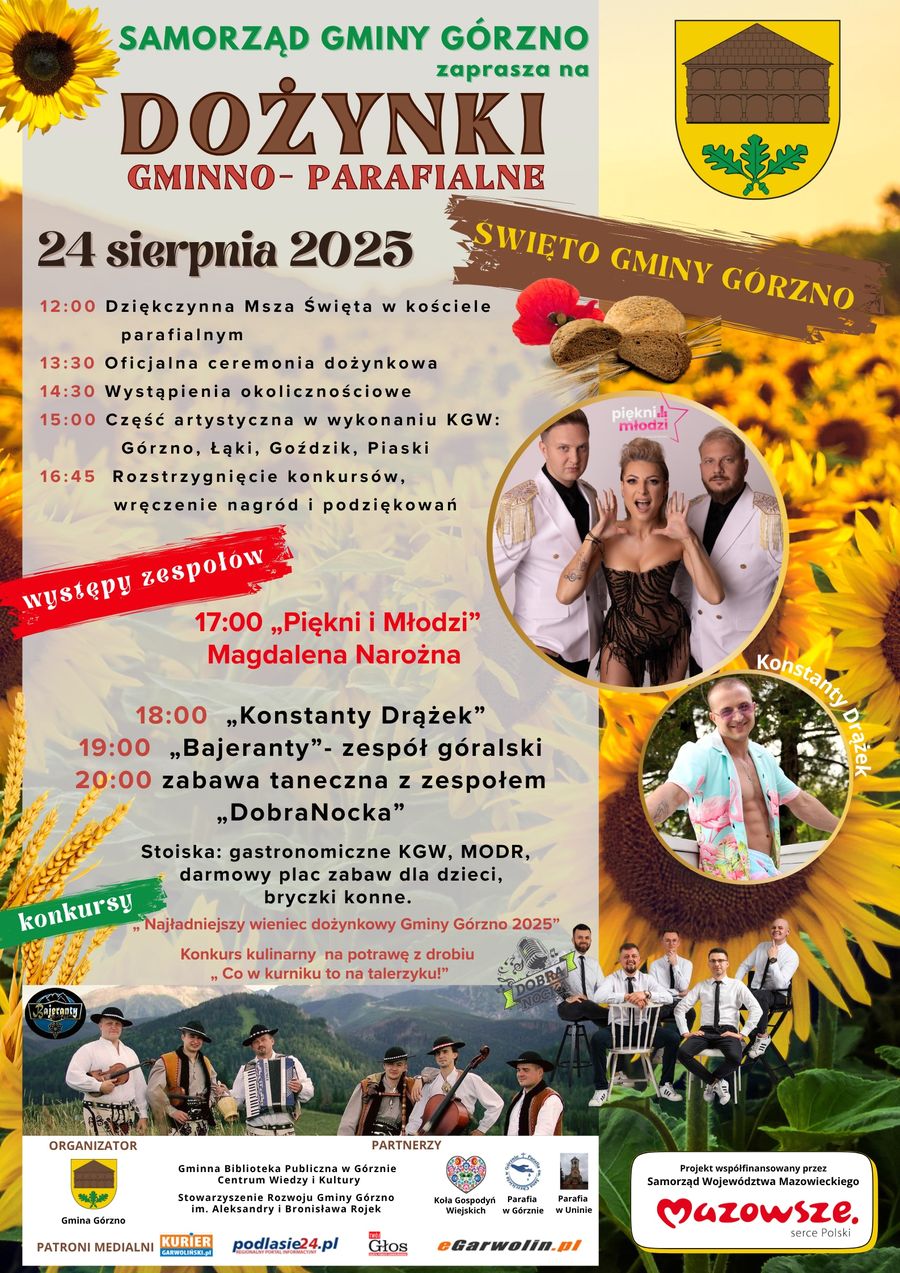 W południe, w kościele parafialnym odprawiona zostanie Msza św., po której barwny korowód przemaszeruje na treny rekreacyjne przy ul. Dworskiej, gdzie celebrowany będzie ceremoniał dożynkowy. - Dożynki to wielka radość z zakończonych żniw, ale także wdzięczność za zbiory, podziękowanie za ciężką pracę. Chociaż na przestrzeni wieków obrzędy dożynkowe zmieniały się, ale zawsze przypominały o ciężkiej pracy rolnika, dzięki której na polskie stoły zawsze trafia chleb – mówi wójt Waldemar Sabak i w imieniu organizatorów zaprasza mieszkańców gminy, powiatu i gości na to wyjątkowe święto. Gospodarz gminy ma nadzieję, że będzie piękna pogoda, wieńce dożynkowe, potrawy serwowane przez koła gospodyń wiejskich i dużo dobrej muzyki. O godz. 15:00 na estradzie swój dorobek artystyczny zaprezentują KGW z Górzna, Łąk, Goździka i miejscowości Piaski. Wystąpi zespół Piękni i Młodzi Magdalena Narożna, „Konstanty Drążek” i zespół góralski „Bajeranty”. Od 20:00 do północy zabawa z zespołem „DobraNocka”. W programie przewidziano również przejazd bryczkami konnymi, będą stoiska z potrawami regionalnymi, wesołe miasteczko i liczne atrakcje dla dzieci.Wydarzenie współfinansowane przez samorząd województwa mazowieckiego.