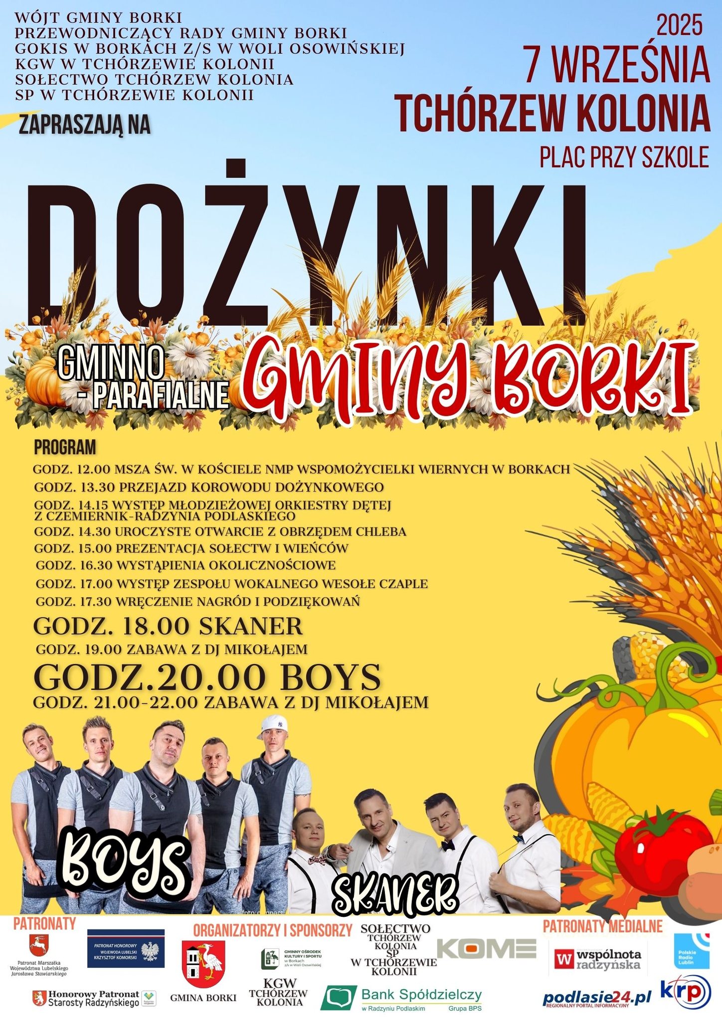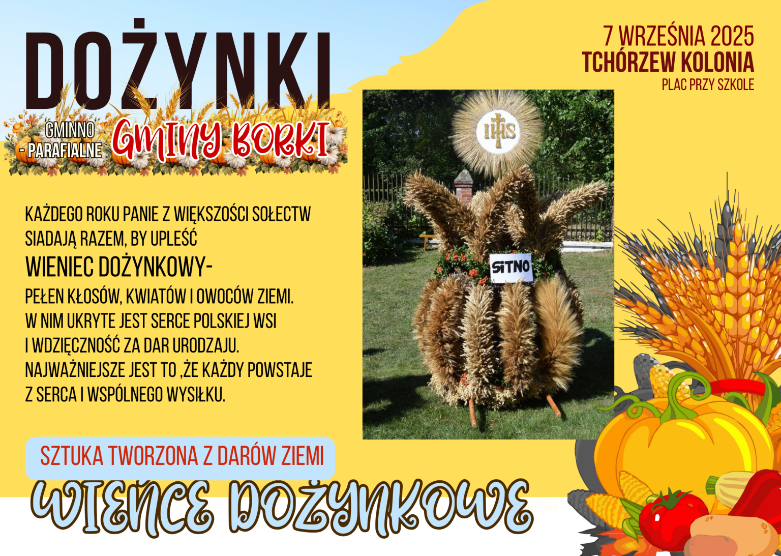 Dożynki to czas radości i dziękczynienia za zebrane plony. 7 września mieszkańcy Gminy Borki spotkają się na dożynkach gminno-parafialnych. Święto plonów rozpocznie się w samo południe Mszą świętą w kościele parafialnym w Borkach. Część oficjalna obchodów odbędzie się w miejscowości Tchórzew Kolonia.