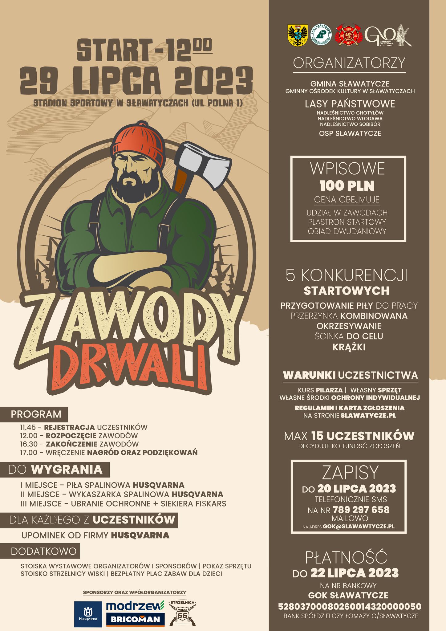 Zawody Drwali w Gminie Sławatycze to niepowtarzalna okazja, aby osobiście doświadczyć prawdziwej siły, zręczności i rywalizacji utalentowanych drwali. Wydarzenie odbędzie się w sobotę, 29 lipca na stadionie sportowym w Sławatyczach.