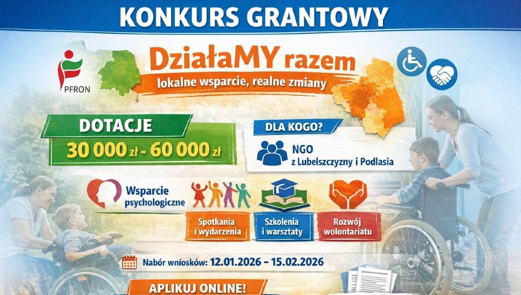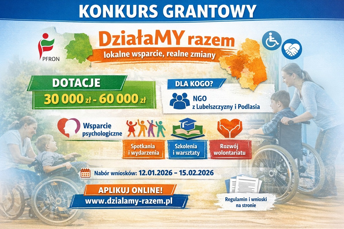 Ruszył kolejny konkurs grantowy realizowany na terenie województwa lubelskiego i podlaskiego, dofinansowany ze środków PFRON w ramach programu „Moc lokalnych inicjatyw”. Program „DziałaMy razem” to inicjatywa skierowana do organizacji i środowisk działających na rzecz osób z niepełnosprawnościami. Jego misją jest wzmacnianie lokalnego potencjału, rozwój dostępności oraz tworzenie przestrzeni, w której działania społeczne mogą realnie wpływać na jakość życia.