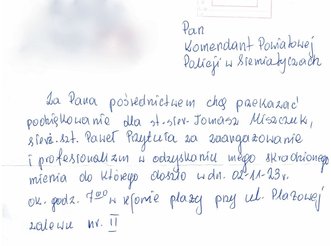 Mieszkaniec pisemnie podziękował mundurowym za „zaangażowanie i profesjonalizm w odzyskaniu skradzionego mienia”.