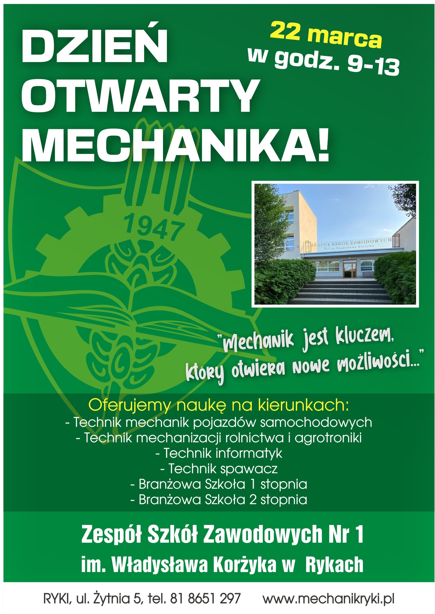 W sobotę, 22 marca w godzinach 9:00 - 13:00, w Zespole Szkół Zawodowych nr 1 im. Władysława Korżyka w Rykach odbędą się dni otwarte.