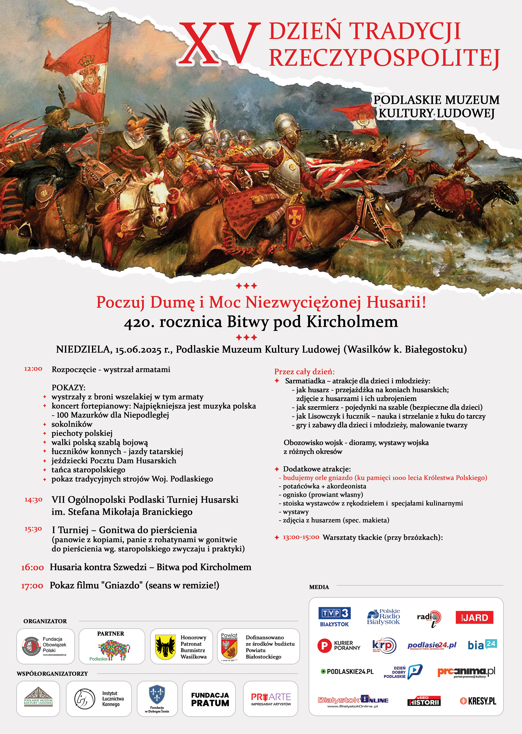 Piętnasta edycja Dnia Tradycji Rzeczypospolitej – dorocznego plenerowego pikniku historycznego organizowanego przez Fundację Obowiązek Polski – odbędzie się na terenie Podlaskiego Muzeum Kultury Ludowej w Wasilkowie w niedzielę, 15 czerwca 2025 roku. Program obejmuje rekonstrukcje historyczne, pokazy militarne i artystyczne oraz liczne atrakcje dla całych rodzin.