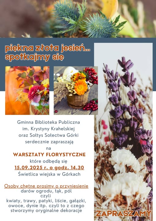 Już w najbliższy poniedziałek, 15 września, w świetlicy wiejskiej odbędą się warsztaty florystyczne, podczas których wykorzystywane będą dary natury – kwiaty, liście, trawy i owoce. Spotkanie poprowadzi Marta Armacińska dyrektor Gminnej Biblioteki Publicznej im. K. Krahelskiej w Sosnowicy.- W warsztatach mogą wziąć udział osoby z naszej miejscowości, ale także spoza niej. Zapraszamy wszystkich miłośników pięknych, kwiatowych kompozycji. Można przynieść ze sobą, dynie, kwiaty ogrodowe, kolorowe liście, patyczki, deseczki i orzechy. Wszystkie te elementy posłużą nam do stworzenia ciekawych bukietów - informuje sołtys Agnieszka Chmielewska. I dodaje: - Warsztaty będą świetną okazją do spędzenia czasu w miłym towarzystwie oraz wierzę w to, że zainspirują uczestników do dalszego tworzenia i rozwijania własnych pasji.
