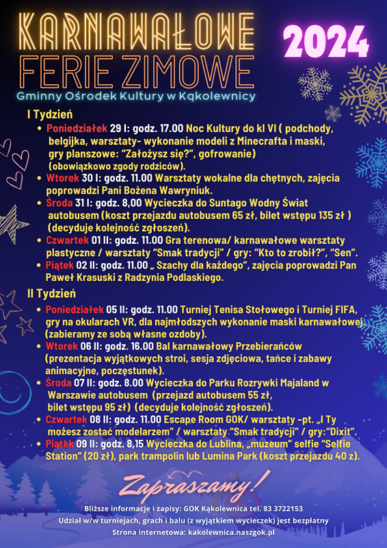 Wiele ciekawych atrakcji dla dzieci i młodzieży szkolnej przygotował na tegoroczne ferie zimowe Gminny Ośrodek Kultury w Kąkolewnicy. W programie m.in. gry i zabawy, warsztaty wokalne i plastyczne, turniej tenisa stołowego, turniej szachowy, bal karnawałowy a także wycieczki do Warszawy i Lublina.
